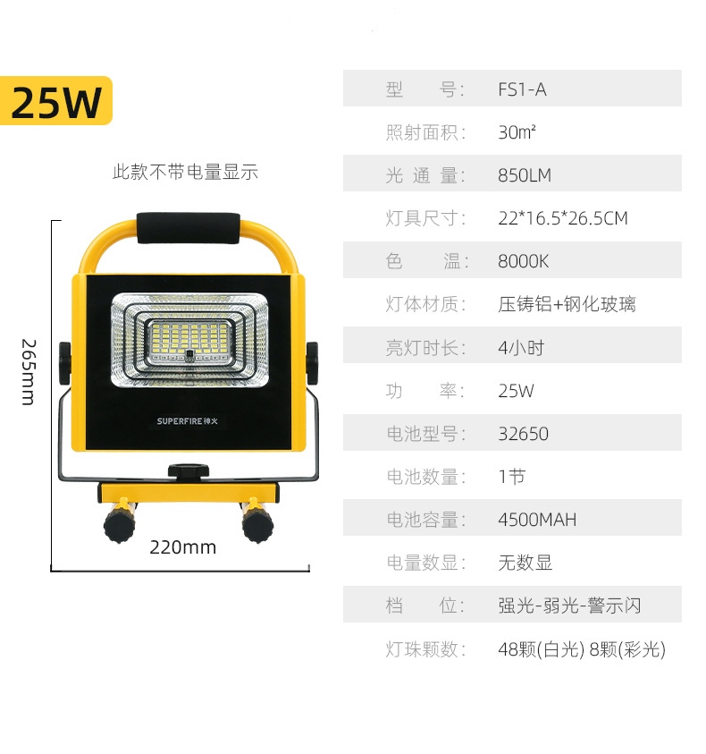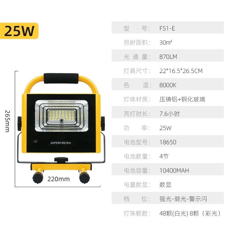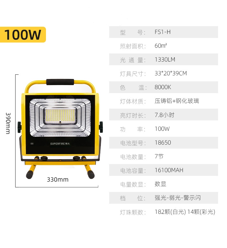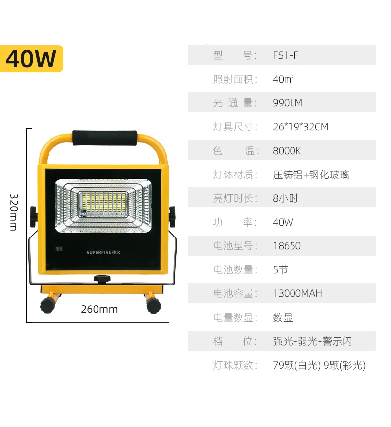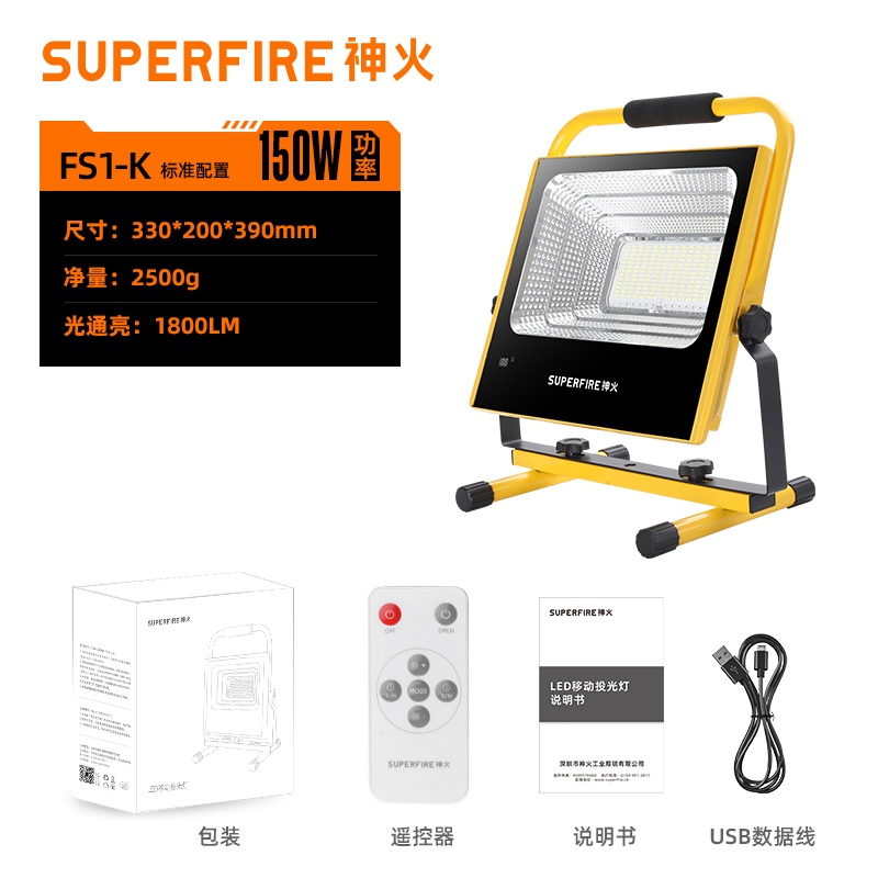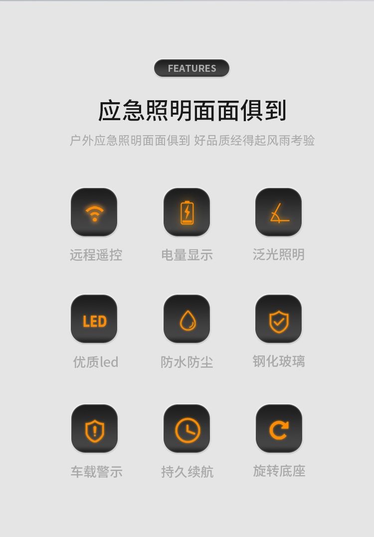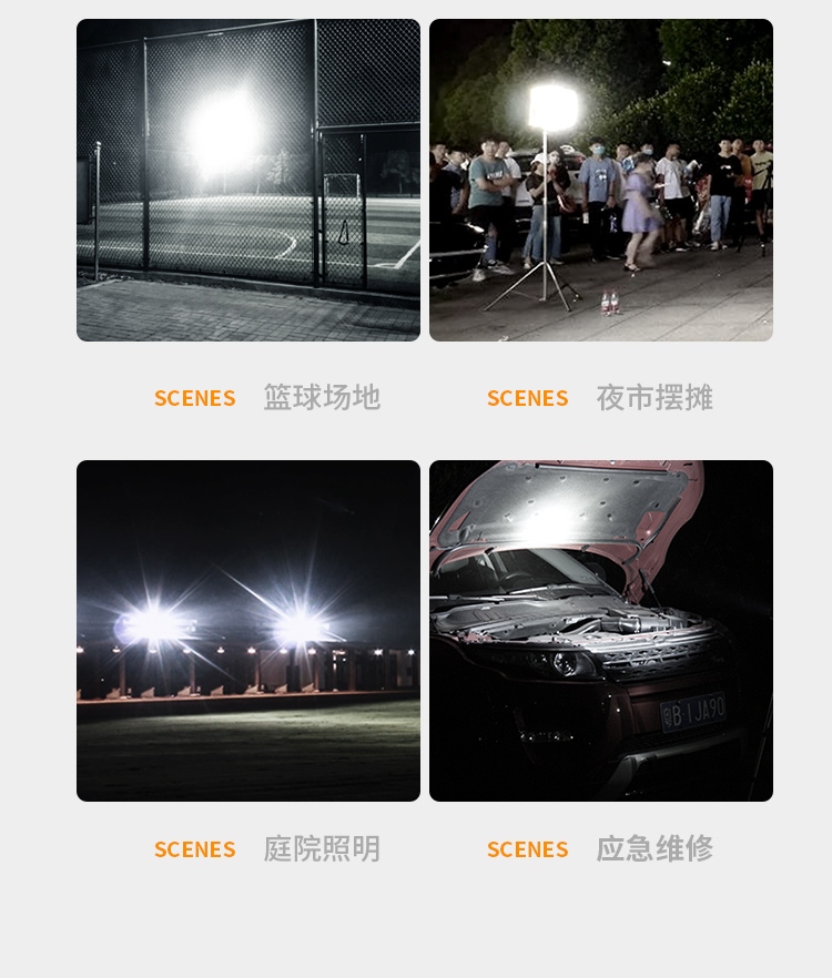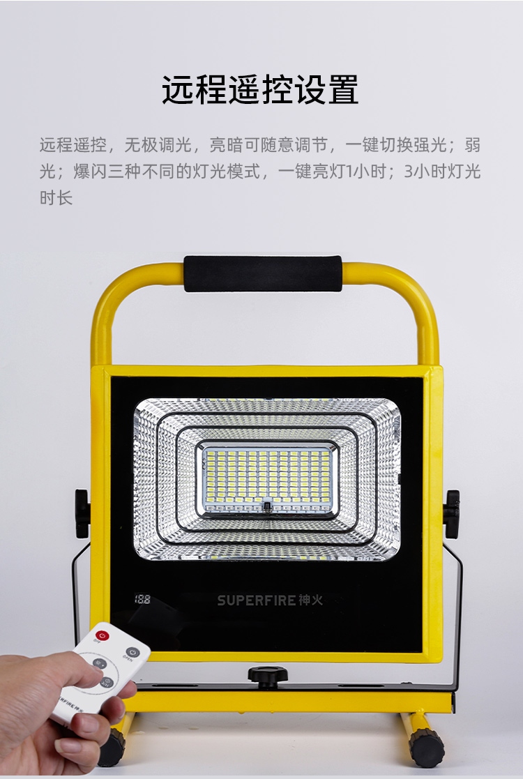 1、多檔調光,可滿足不同使用場景下的照明需求; 2、含提手,握感更舒適。攜帶更簡單; 3、新型高亮遠射燈珠,60W大功率,亮度高,照明效果好。