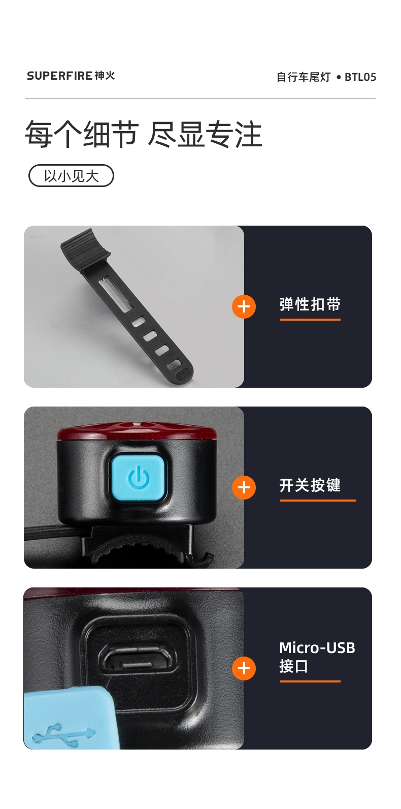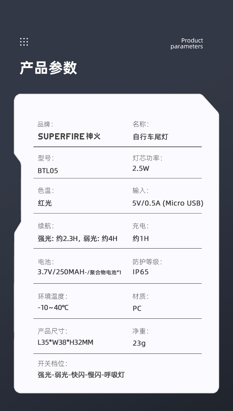 聚光主燈 亮度隨心 輕按后端開關按鈕,主燈強光點亮,續按依次切換主燈工作光-爆閃光。主燈開啟狀態下長按5秒,可實現光源色溫轉換。主燈關閉狀態下長按5秒,可開啟燈具最亮照明模式。 爆亮強光 亮如白晝 1500LM大功率高亮光源,點亮頃刻如白晝