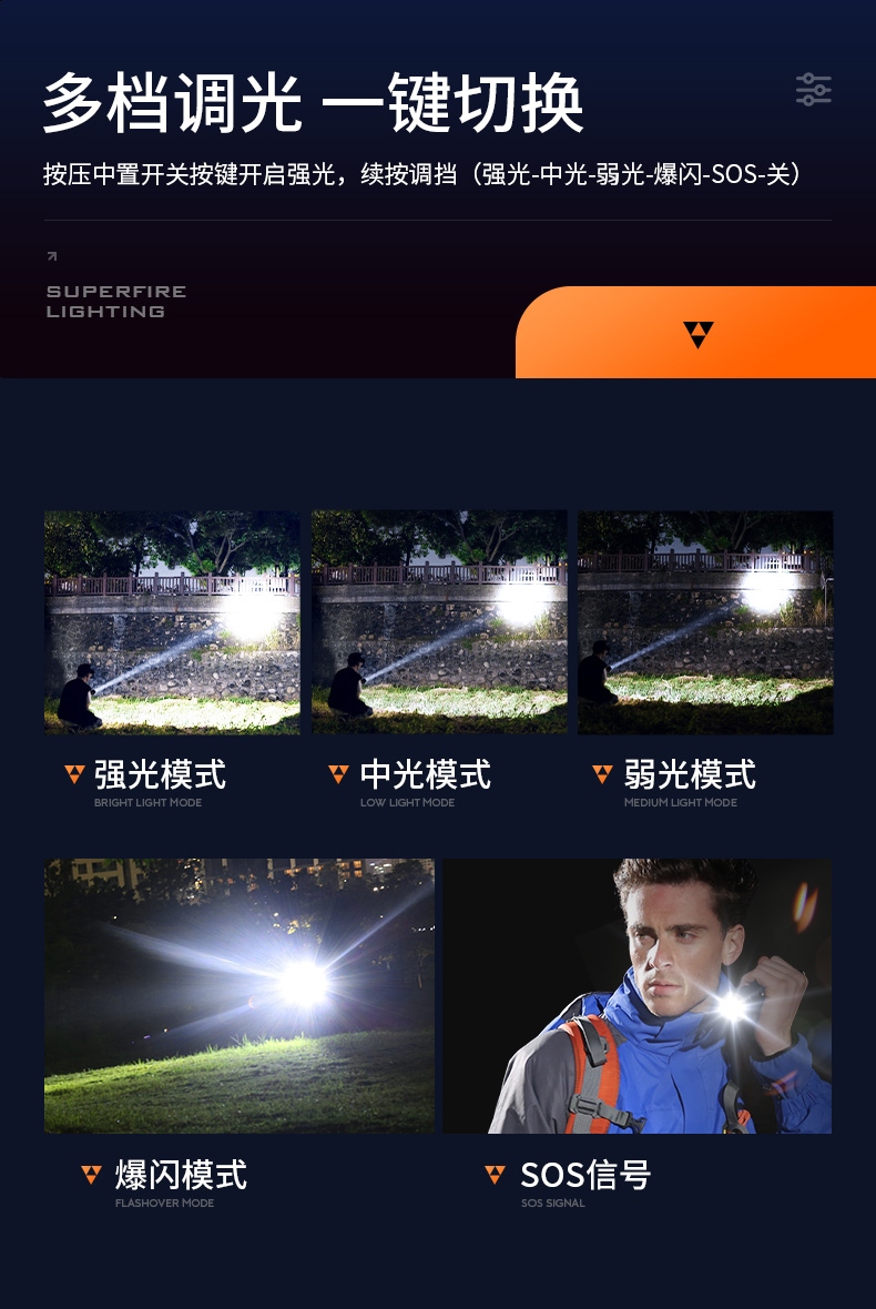 1、六檔調光,可滿足不同使用場景下的照明需求。 2、進口高亮朗明納斯燈珠,照明效果更好。 3、含檔位記憶,任意檔位快捷關機 ,開機恢復關機前檔位。