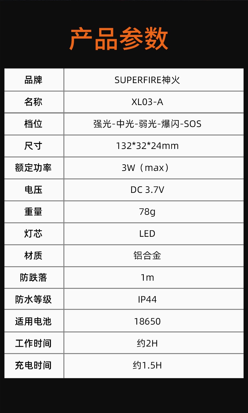 1、千米遠(yuǎn)射,射程更遠(yuǎn),光斑更聚焦。 2、進(jìn)口燈珠,亮度高,照明效果更好。 3、前后雙按鍵,光源一鍵點亮,高亮瞬間開啟。