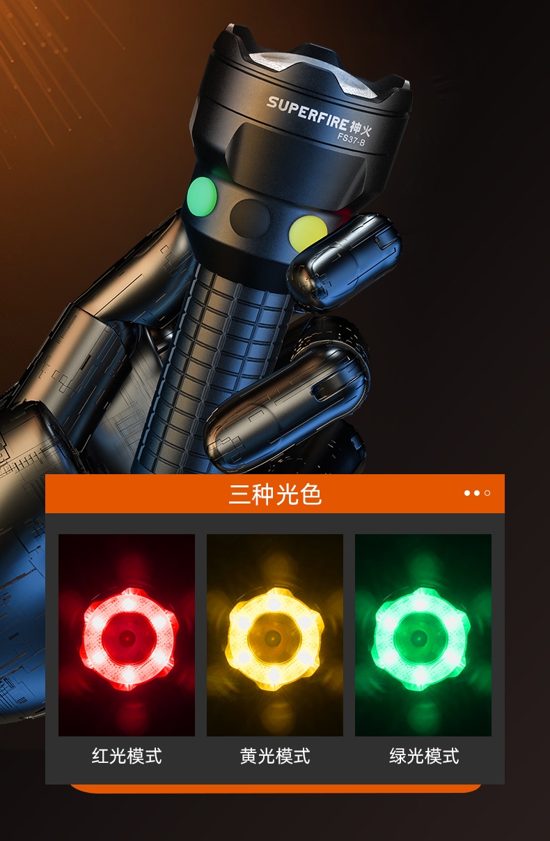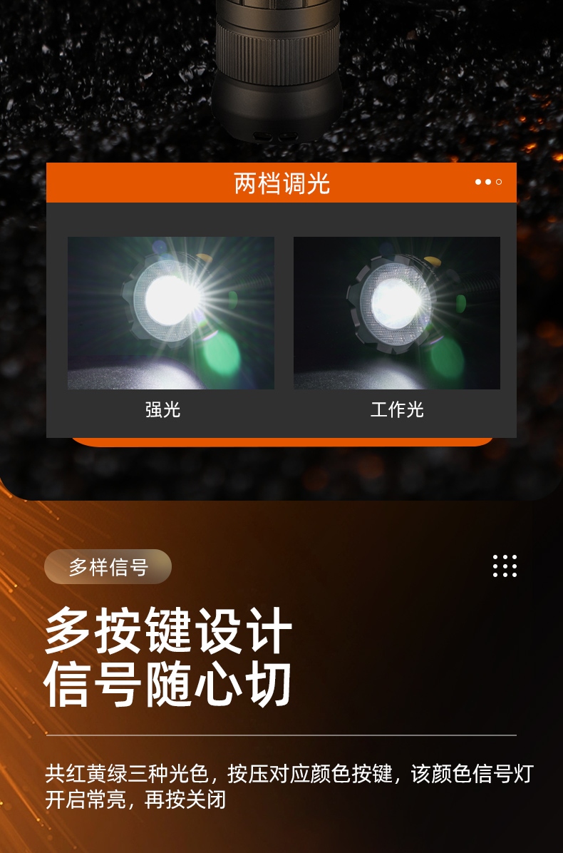 按下黑色按鍵開啟白光,檔位依次為“強(qiáng)光-工作光關(guān)閉循環(huán),長按開啟白光頻閃