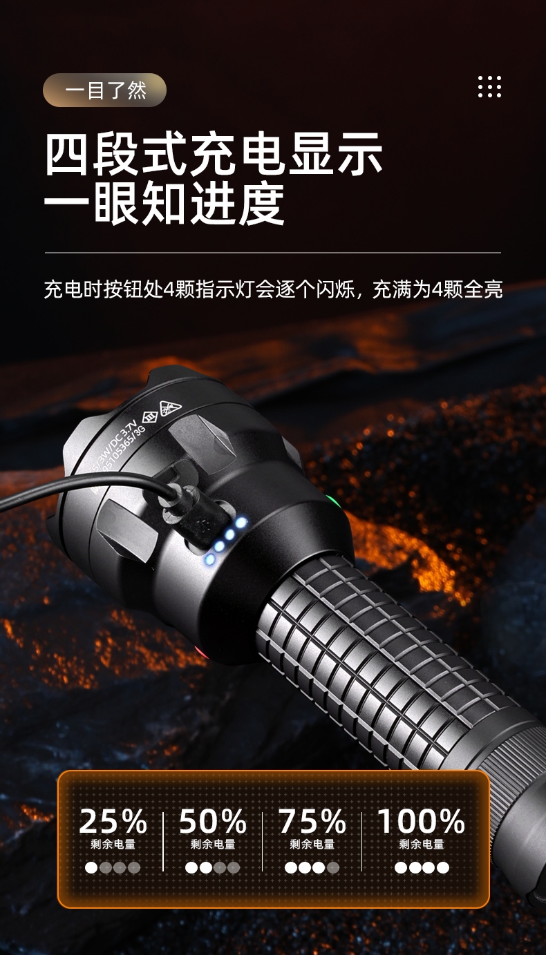 充電時(shí)按鈕處4顆指示燈會(huì)逐個(gè)閃爍,充滿為4顆全亮