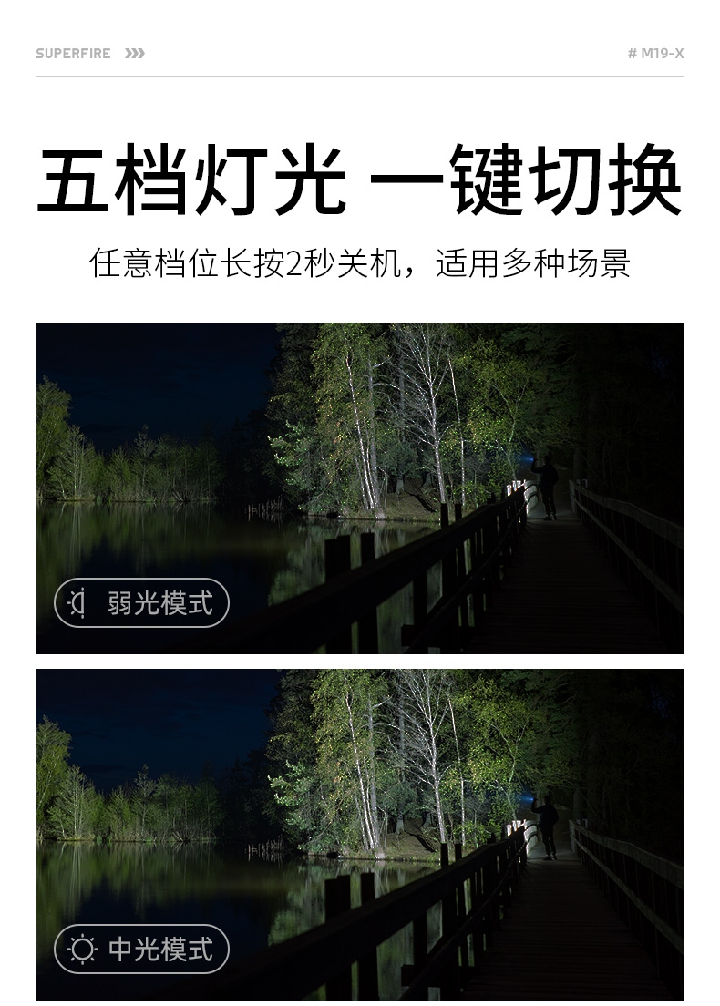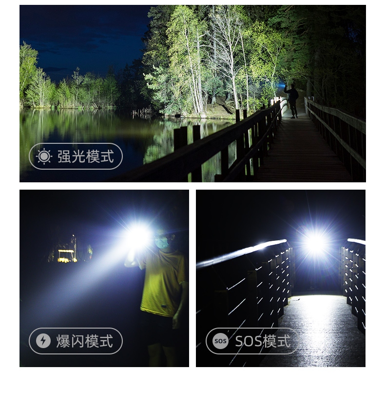 1、多檔調(diào)光(弱-中-強(qiáng)-爆閃-SOS),可滿足不同場(chǎng)景下的使用需求。