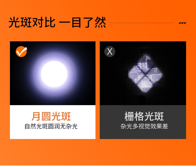 1、推拉燈頭可實現伸縮調焦。 2、圓形光斑設計,照明效果更好。 3、含尾燈、前后雙燈照明,可滿足多種環境下使用。