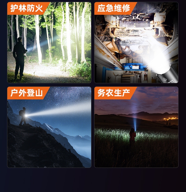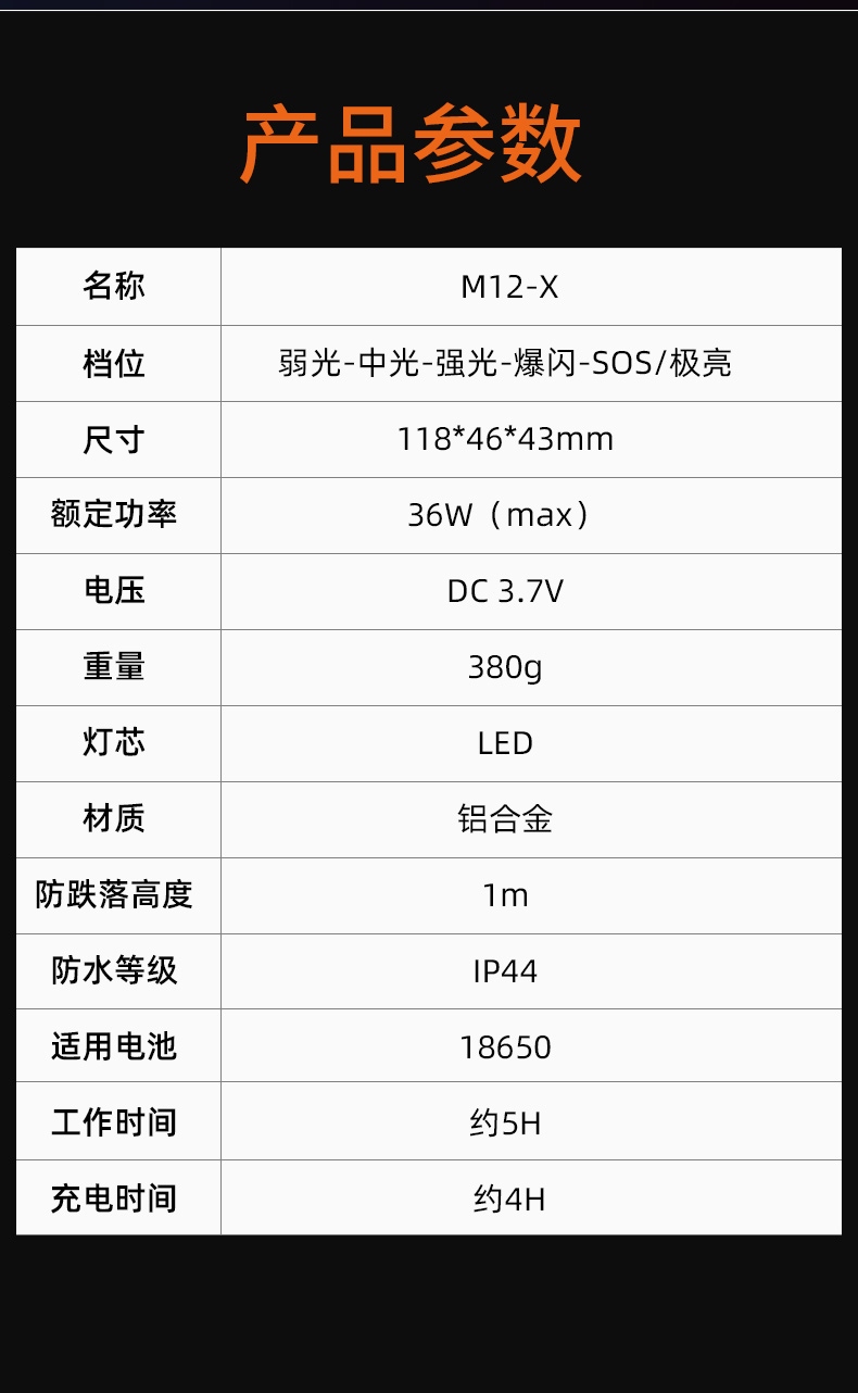 聚光主燈 亮度隨心 輕按后端開關按鈕,主燈強光點亮,續按依次切換主燈工作光-爆閃光。主燈開啟狀態下長按5秒,可實現光源色溫轉換。主燈關閉狀態下長按5秒,可開啟燈具最亮照明模式。 爆亮強光 亮如白晝 1500LM大功率高亮光源,點亮頃刻如白晝