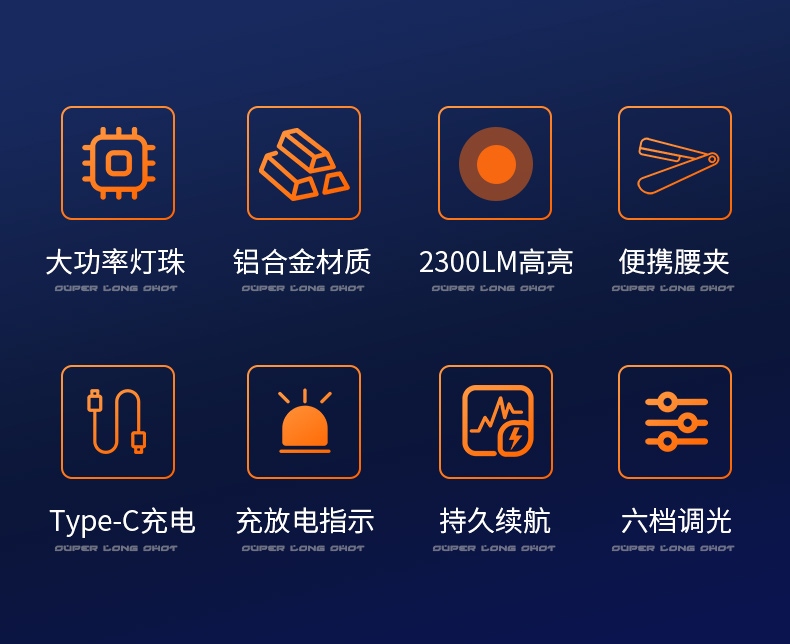 1、按壓中部開關按鍵3S開啟光源,續按(弱光-中光-強光-爆閃-SOS)檔位順序循環,雙擊開啟極亮檔. 2、最高亮度2300LM,多檔照明,滿足不同場景的使用要求。 3、帶充、放電指示燈,充、放電狀態一目了然。