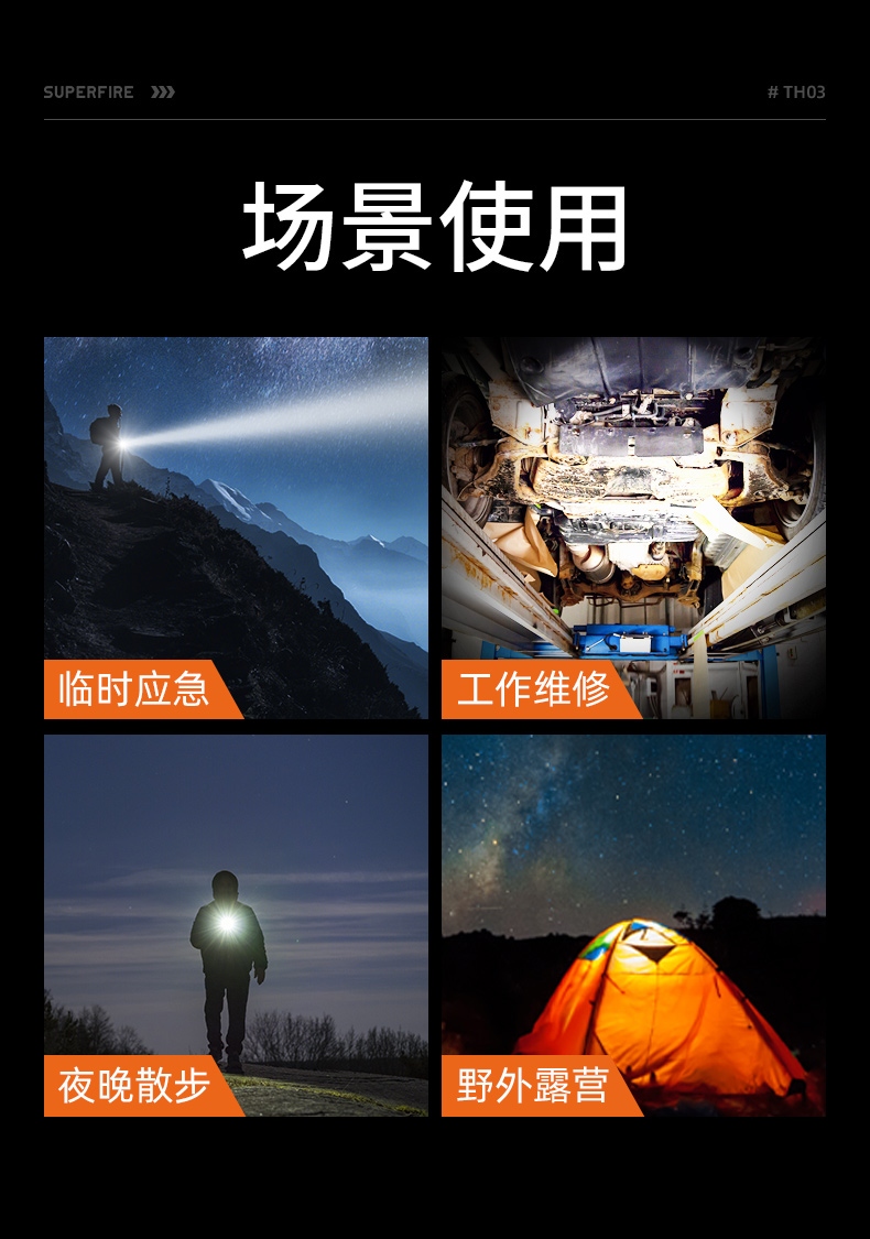 強(qiáng)光亮度,運(yùn)動(dòng)頭燈,前后均衡設(shè)計(jì),輕便不壓頭,可調(diào)節(jié)式頭燈帶,佩戴方便舒適,伸縮調(diào)焦,光照范圍大,照射距離遠(yuǎn),頭燈角度調(diào)節(jié),超90度角度隨意調(diào)節(jié),適宜各種環(huán)境使用