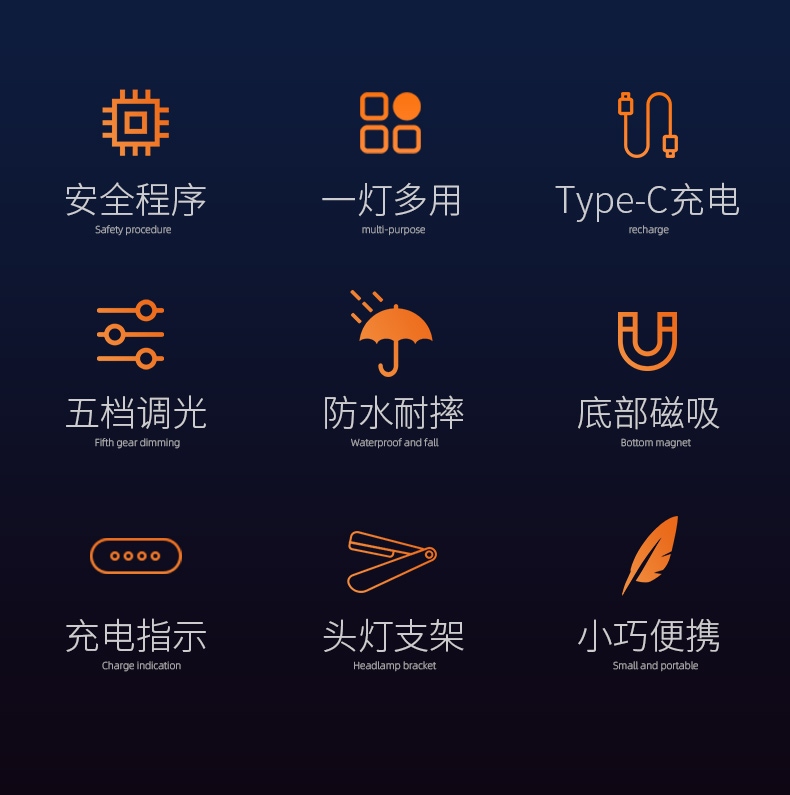 1.單擊左邊開關(guān)開啟感應(yīng)功能,同時(shí)開啟強(qiáng)光檔,續(xù)按關(guān)閉感應(yīng)功能(關(guān)閉感應(yīng)功能,光源不會(huì)關(guān)閉),當(dāng)感應(yīng)功能開啟時(shí),單擊右邊開關(guān)可正常調(diào)節(jié)檔位。 2.多樣化充電,使用方便:設(shè)有Type-c充電口,可使用充電器、充電寶、電腦等設(shè)備為燈具充電。 3.電量顯示:實(shí)時(shí)