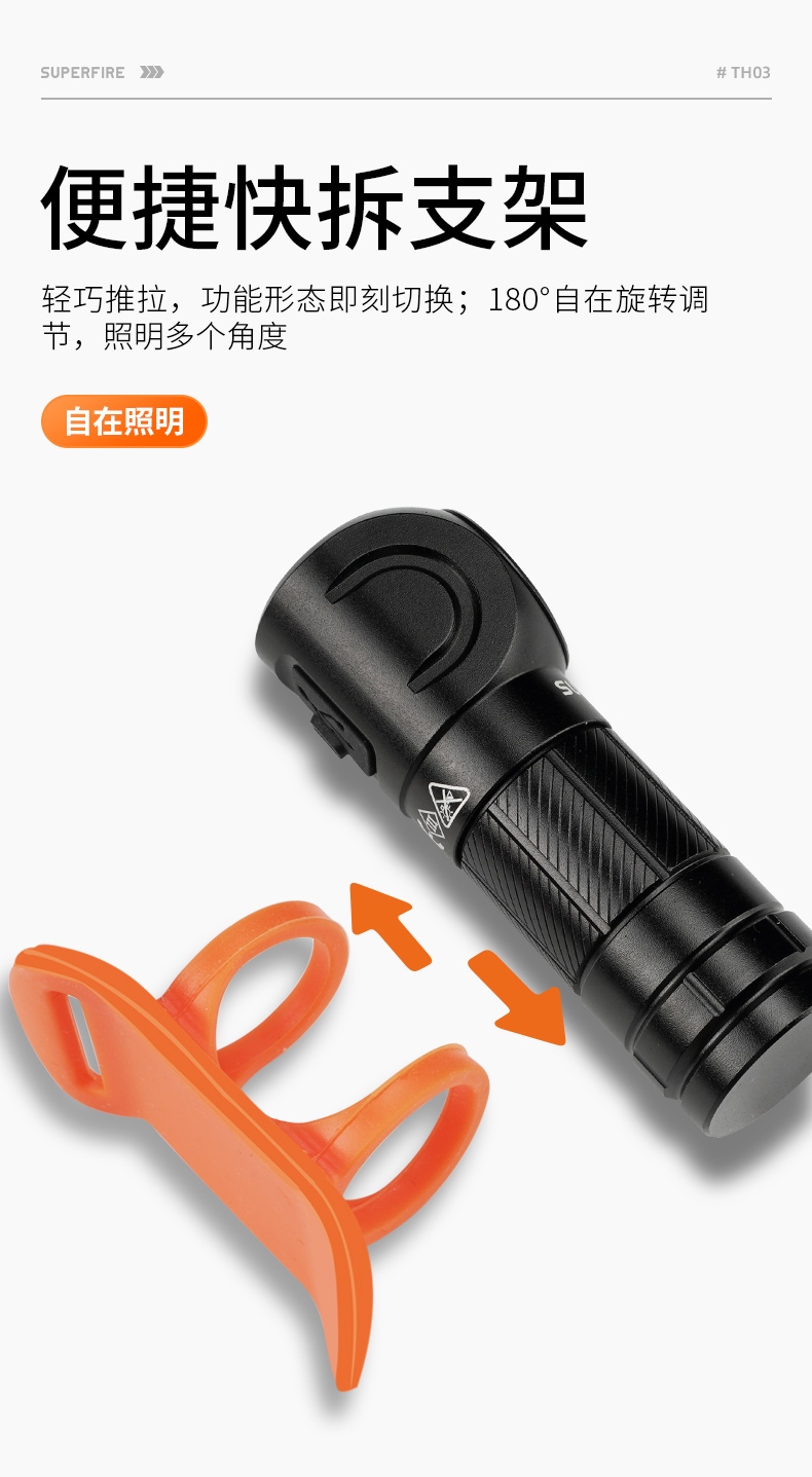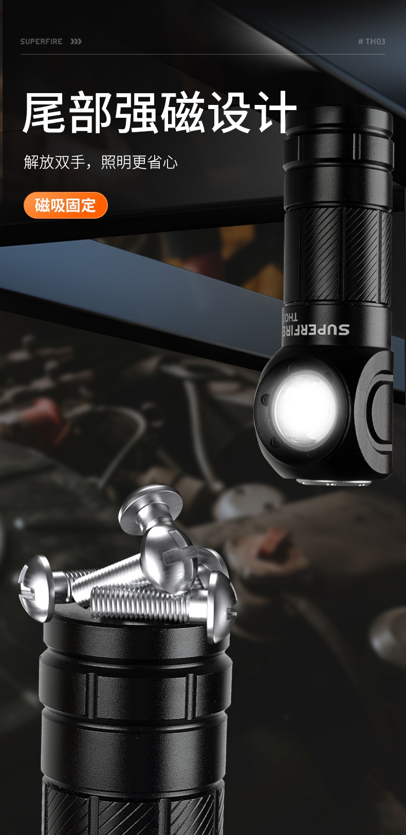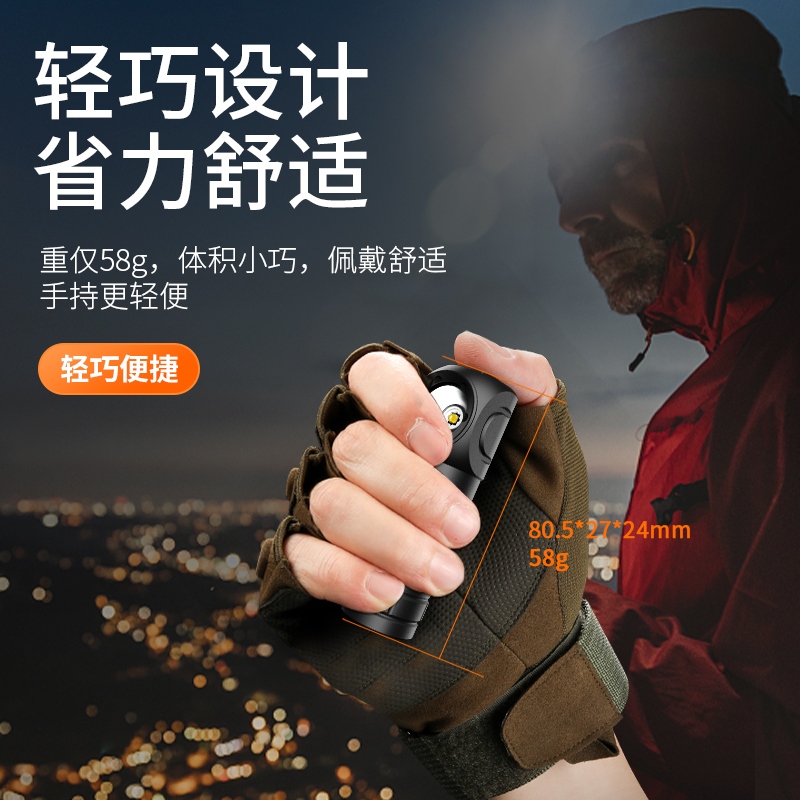 1.一燈兩用,既是小巧頭燈也是拐角手電。 2.配有頭燈支架與頭燈帶,使用更方便。 3.尾部磁吸設(shè)計(jì),固定和調(diào)節(jié)更加快捷。