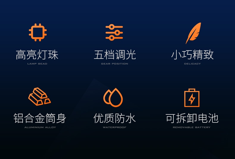 1、多檔調光,可滿足不同環境下的照明需求。 2、鋁合金筒身,防水耐摔。 3、外置電池,可隨時更換電池,延長使用時間。