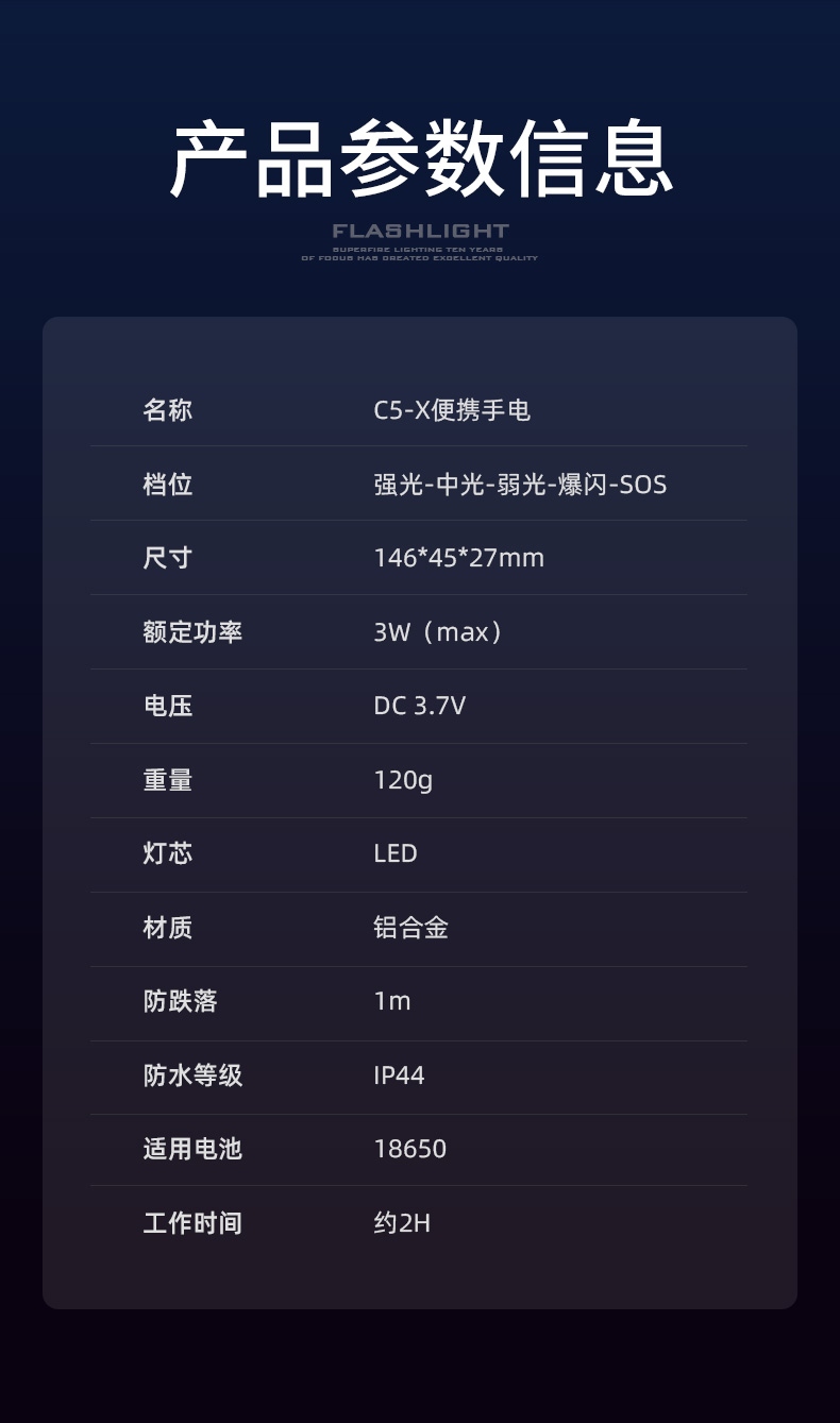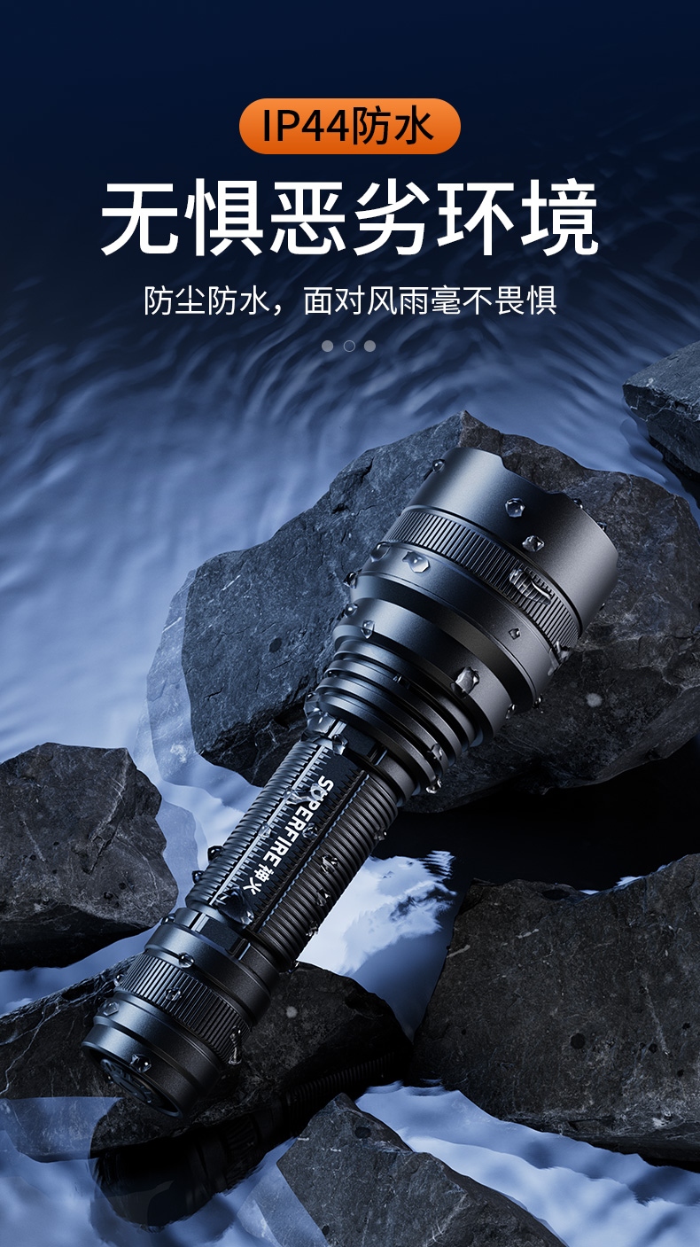 聚光主燈 亮度隨心 輕按后端開關按鈕,主燈強光點亮,續按依次切換主燈工作光-爆閃光。主燈開啟狀態下長按5秒,可實現光源色溫轉換。主燈關閉狀態下長按5秒,可開啟燈具最亮照明模式。 爆亮強光 亮如白晝 1500LM大功率高亮光源,點亮頃刻如白晝