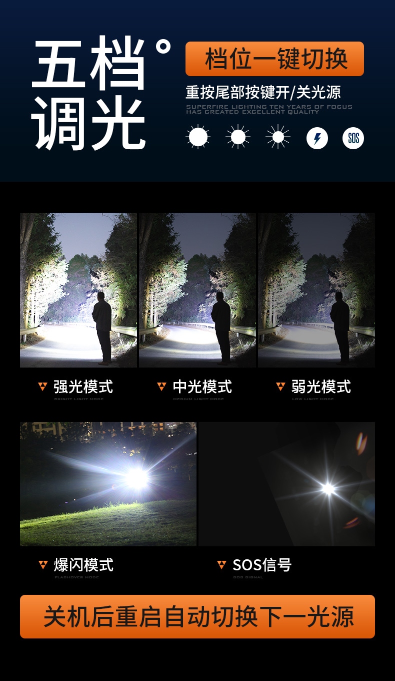 1、六檔調光,可滿足不同使用場景下的照明需求。 2、進口高亮朗明納斯燈珠,照明效果更好。 3、含檔位記憶,任意檔位快捷關機 ,開機恢復關機前檔位。