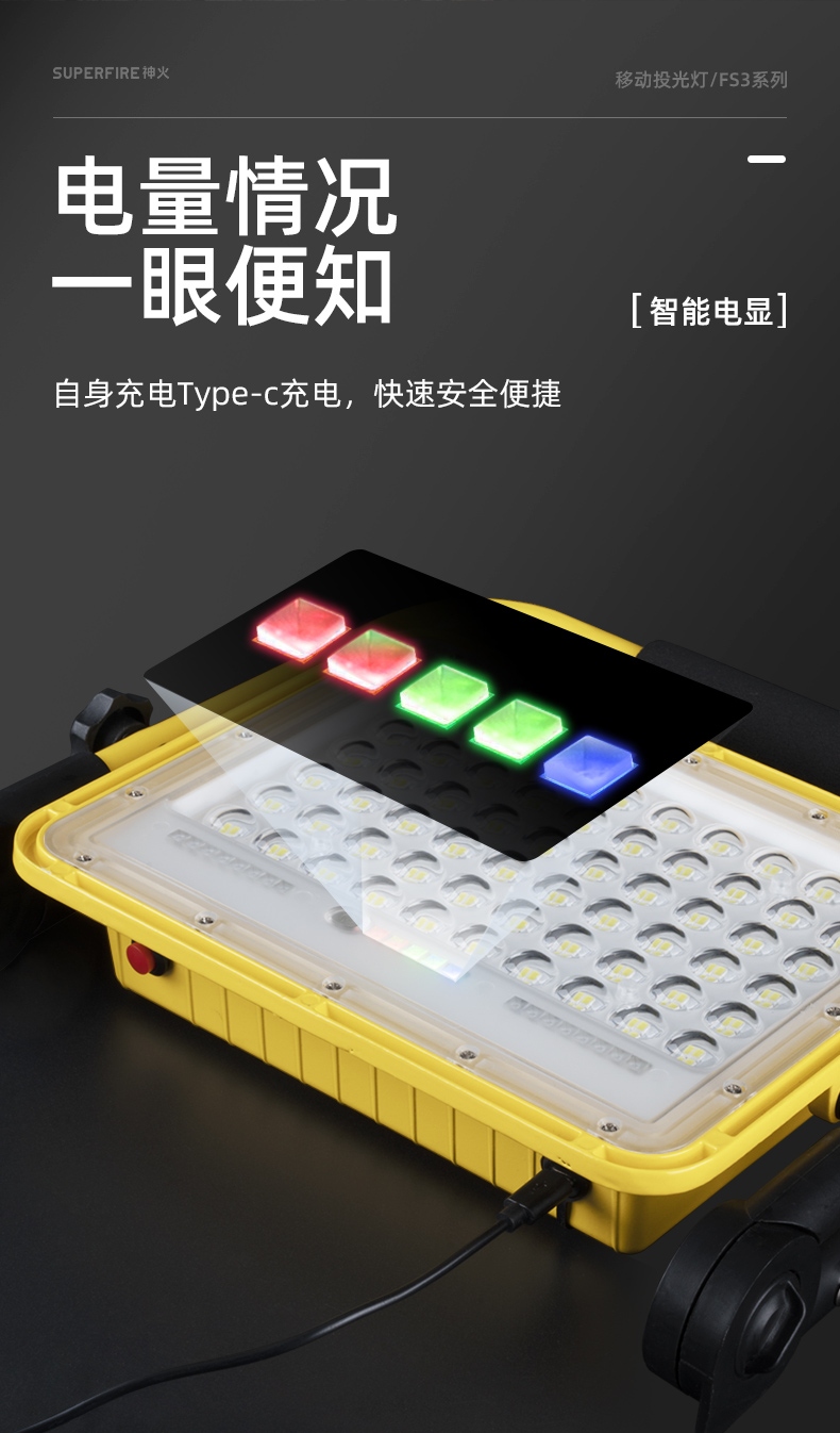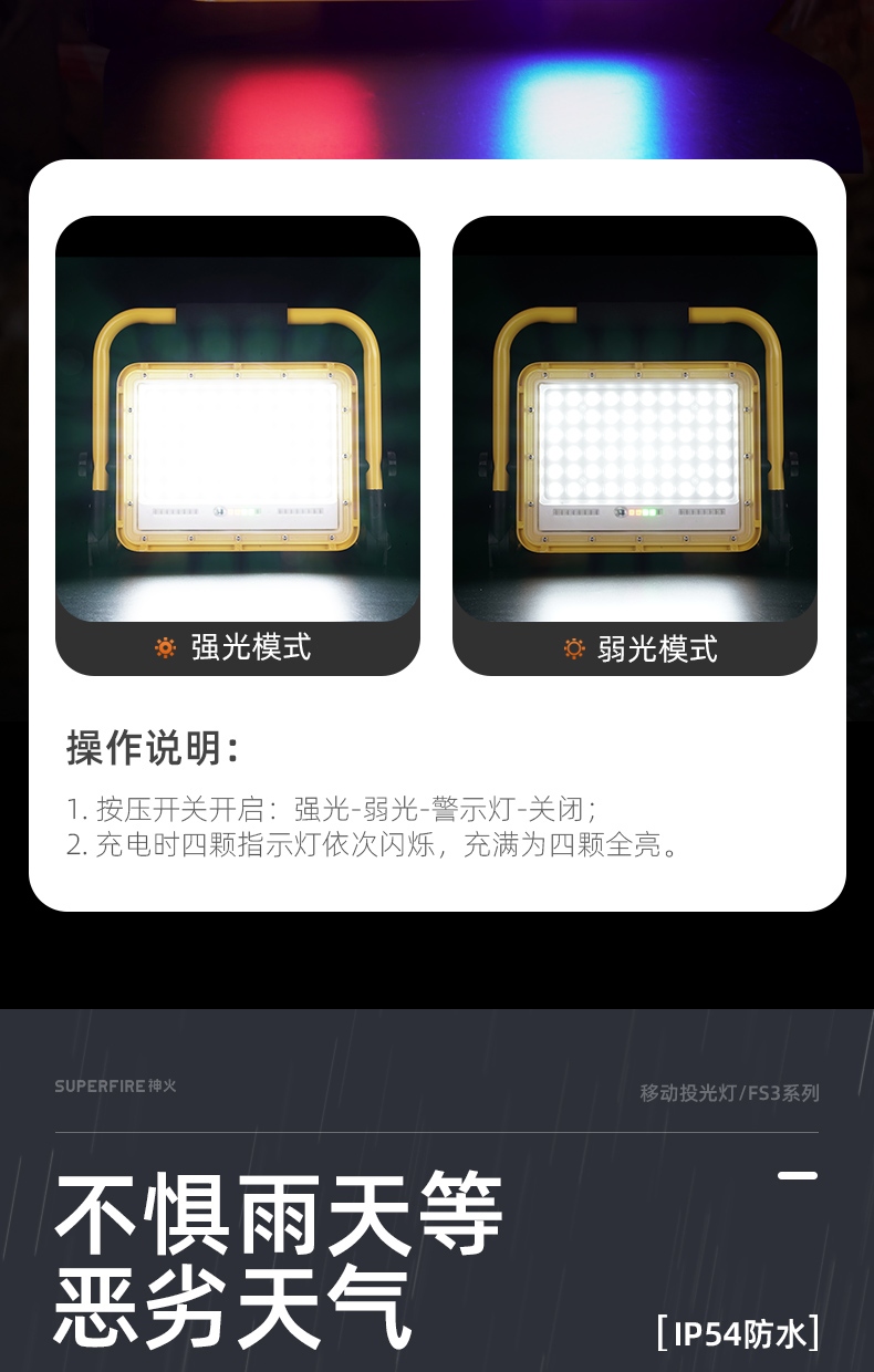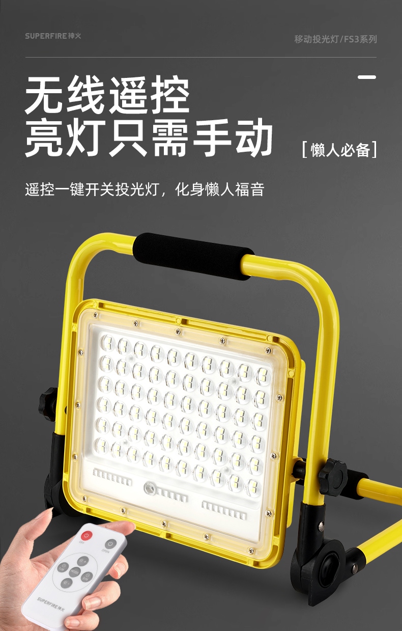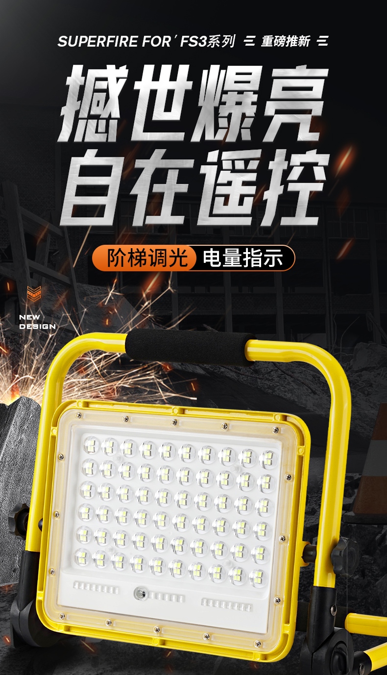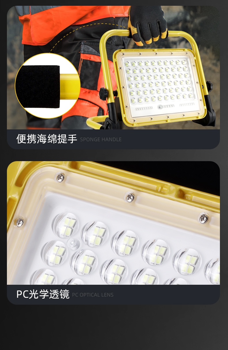 1、多檔調光,可滿足不同使用場景下的照明需求; 2、含提手,握感更舒適。攜帶更簡單; 3、新型高亮遠射燈珠,60W大功率,亮度高,照明效果好。