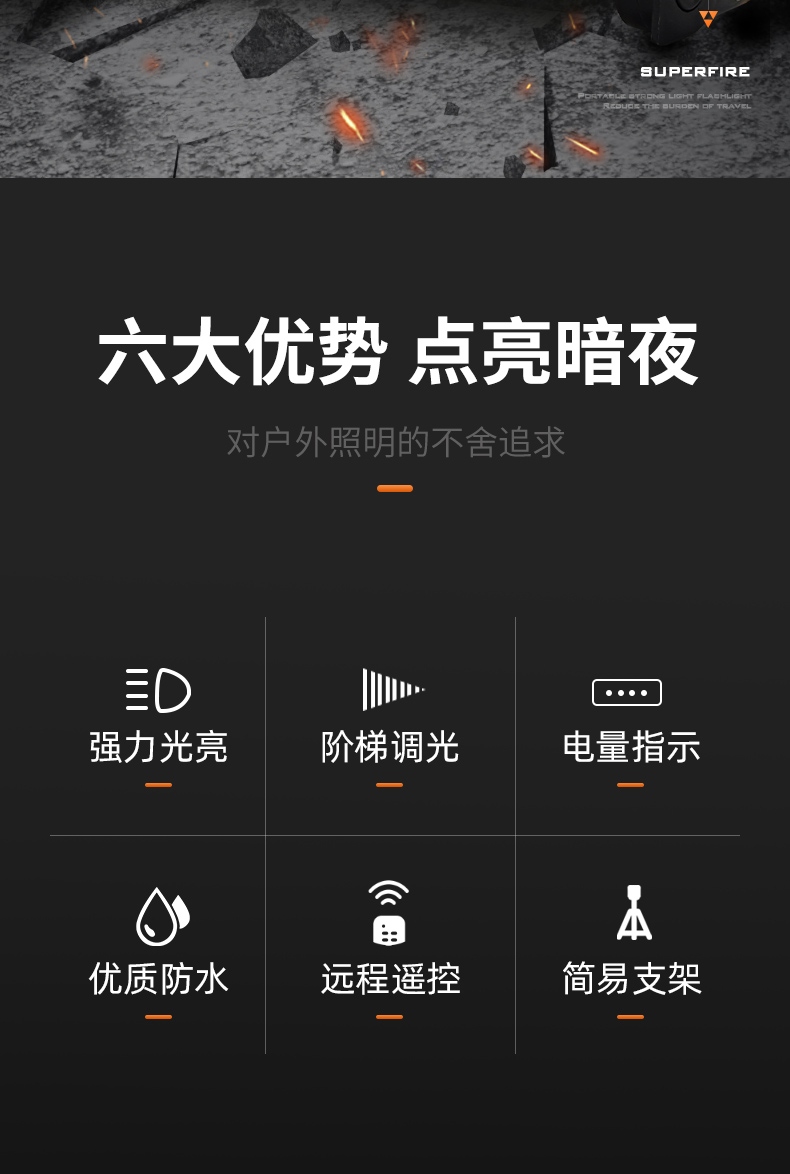 六大優勢 點亮暗夜 對戶外照明的不舍追求 強力光亮 優質防水 階梯調光 遠程遙控 電量指示 簡易支架