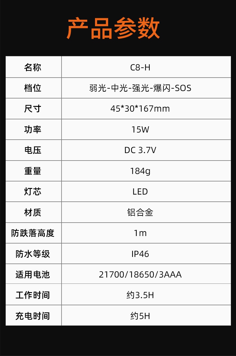 聚光主燈 亮度隨心 輕按后端開關按鈕,主燈強光點亮,續按依次切換主燈工作光-爆閃光。主燈開啟狀態下長按5秒,可實現光源色溫轉換。主燈關閉狀態下長按5秒,可開啟燈具最亮照明模式。 爆亮強光 亮如白晝 1500LM大功率高亮光源,點亮頃刻如白晝