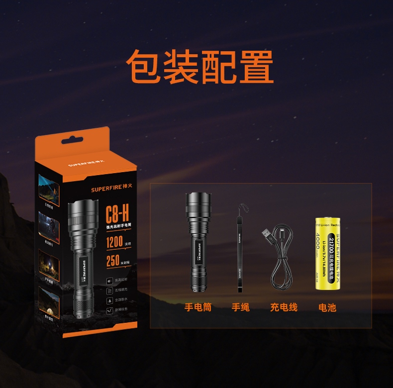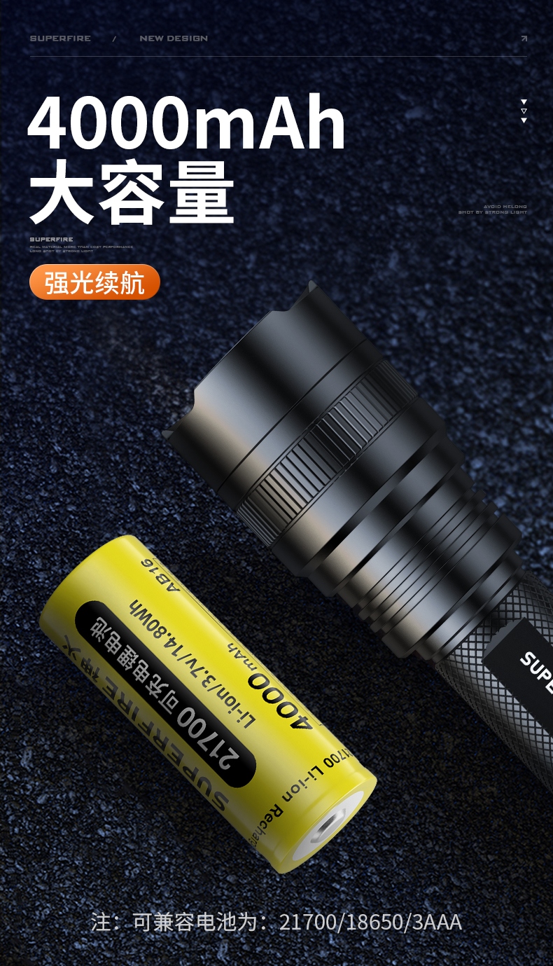最新款15W大功率手電,隱藏式直充防水性能更好,支持快充,使用21700高容量鋰電池,也可兼容18650電池。