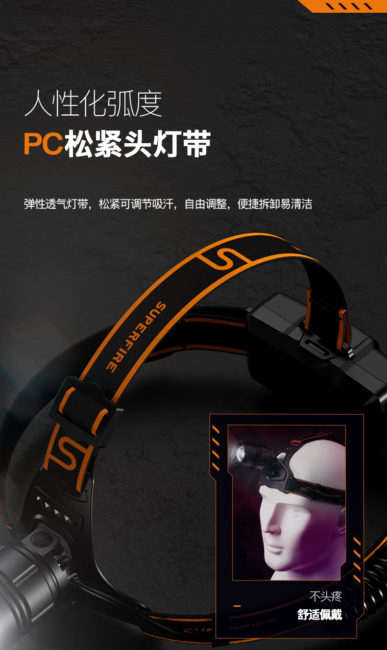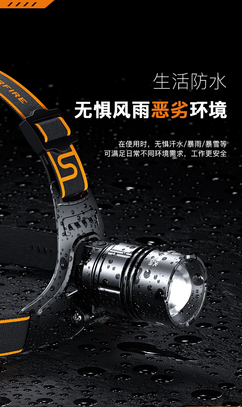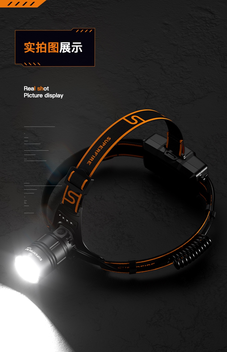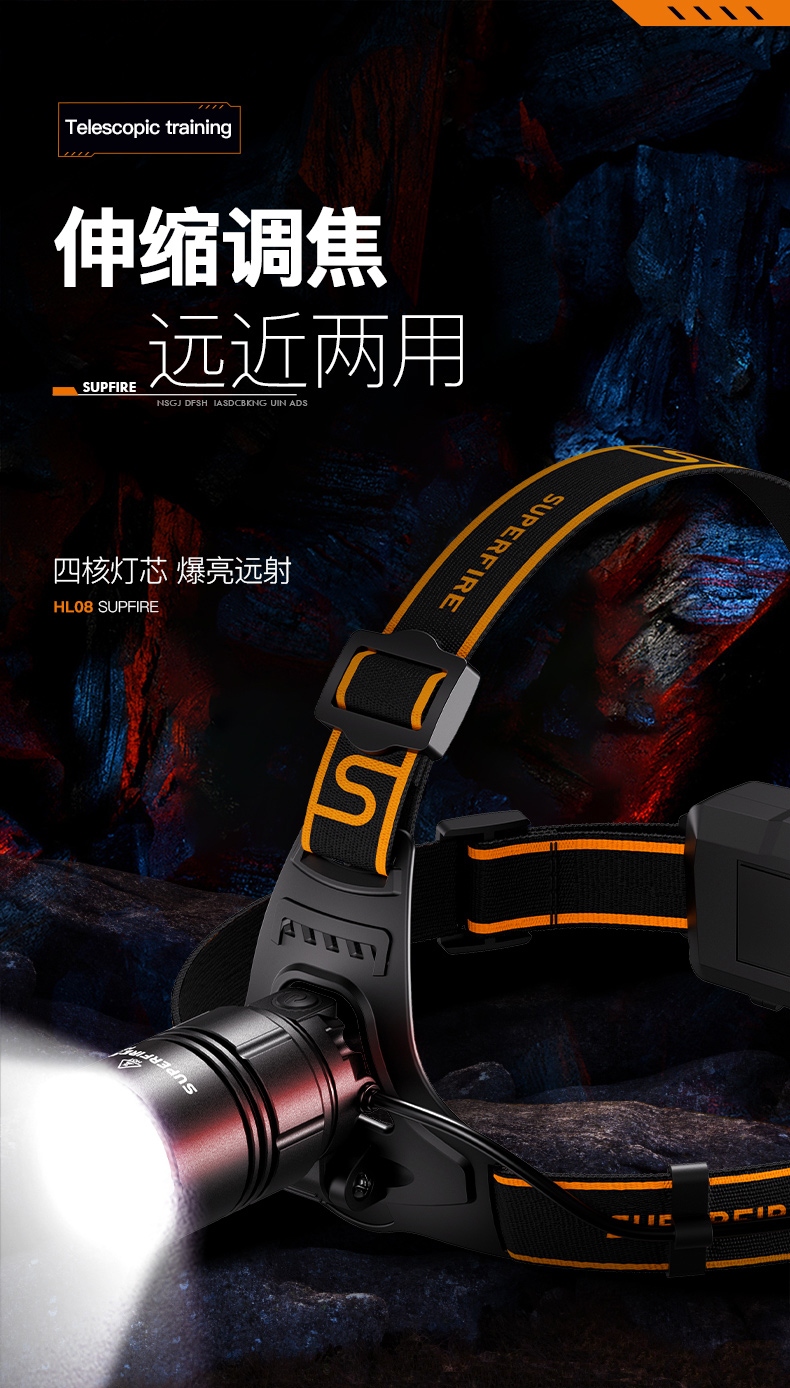 強光亮度,運動頭燈,前后均衡設計,輕便不壓頭,可調節式頭燈帶,佩戴方便舒適,伸縮調焦,光照范圍大,照射距離遠,頭燈角度調節,超90度角度隨意調節,適宜各種環境使用
