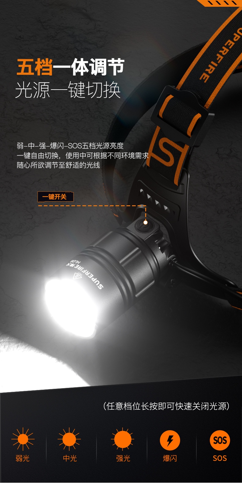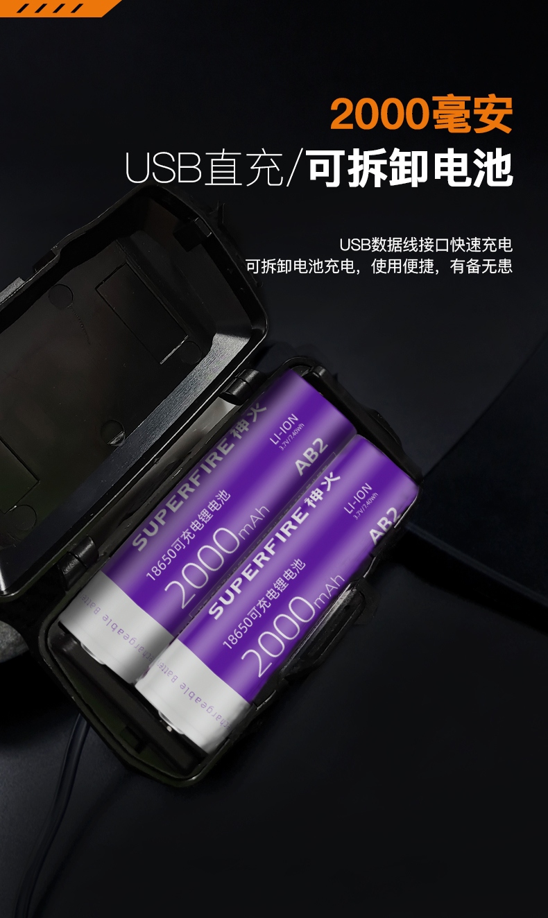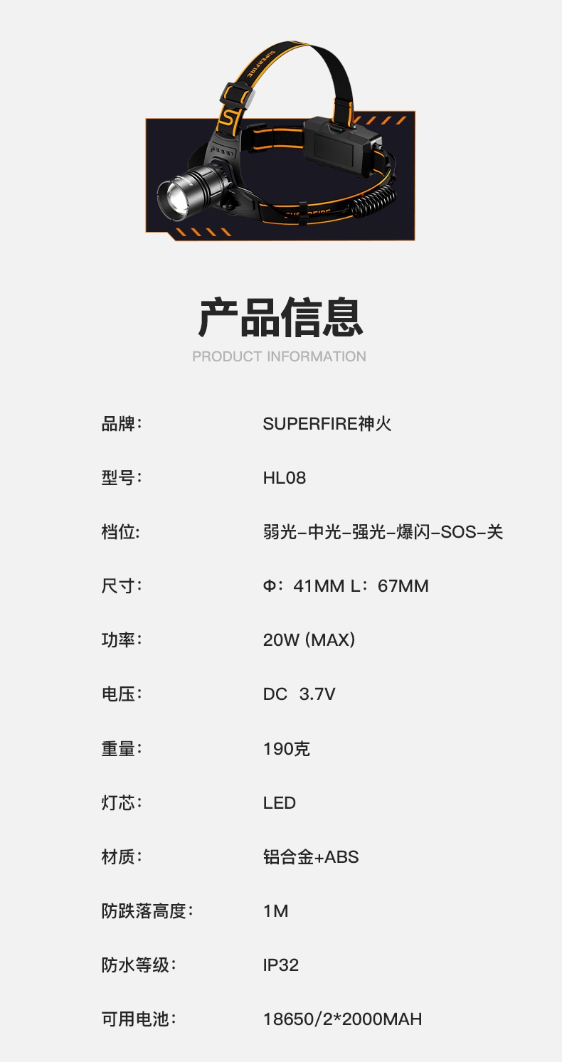 強光亮度,運動頭燈,前后均衡設計,輕便不壓頭,可調節式頭燈帶,佩戴方便舒適,伸縮調焦,光照范圍大,照射距離遠,頭燈角度調節,超90度角度隨意調節,適宜各種環境使用