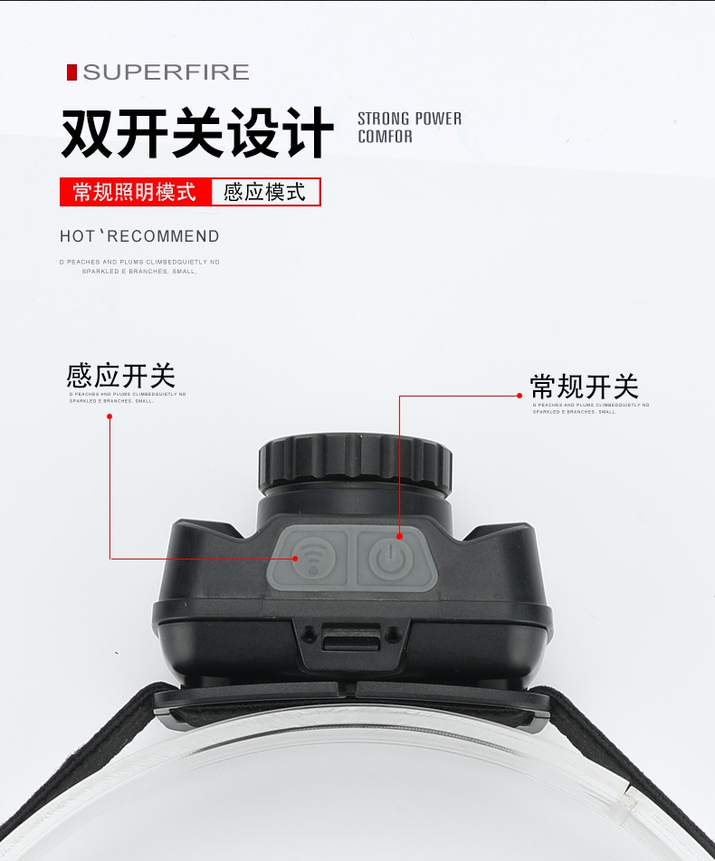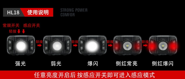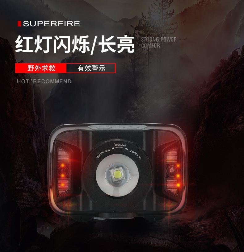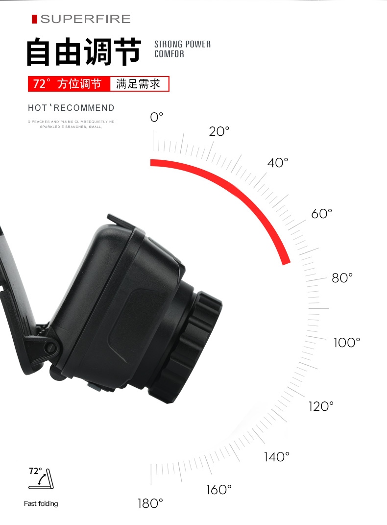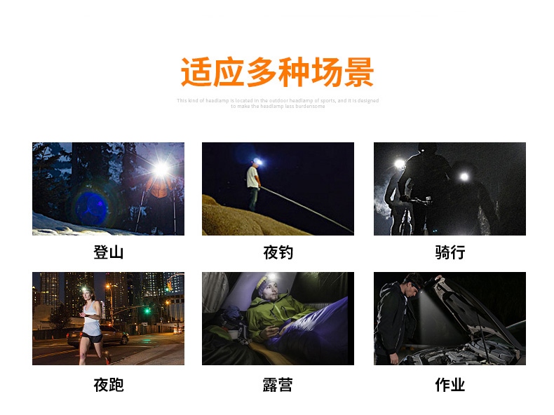 強光亮度,運動頭燈,前后均衡設計,輕便不壓頭,可調節式頭燈帶,佩戴方便舒適,伸縮調焦,光照范圍大,照射距離遠,頭燈角度調節,超90度角度隨意調節,適宜各種環境使用