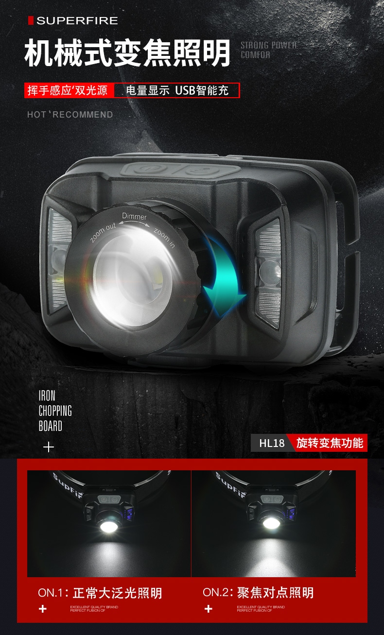 可調焦,外觀時尚、(紅光、白光)手掃感應頭燈