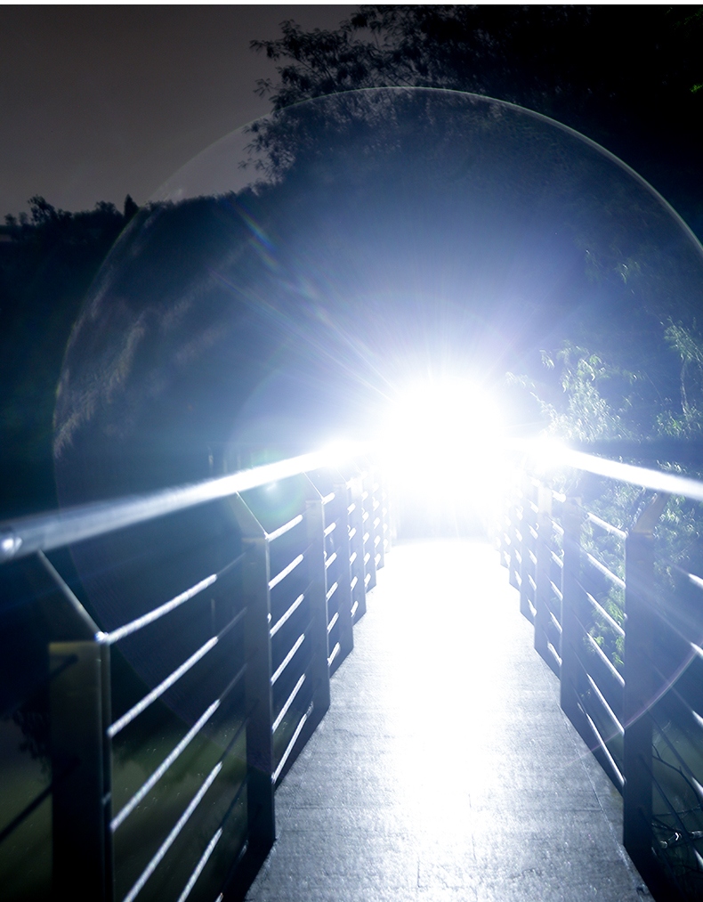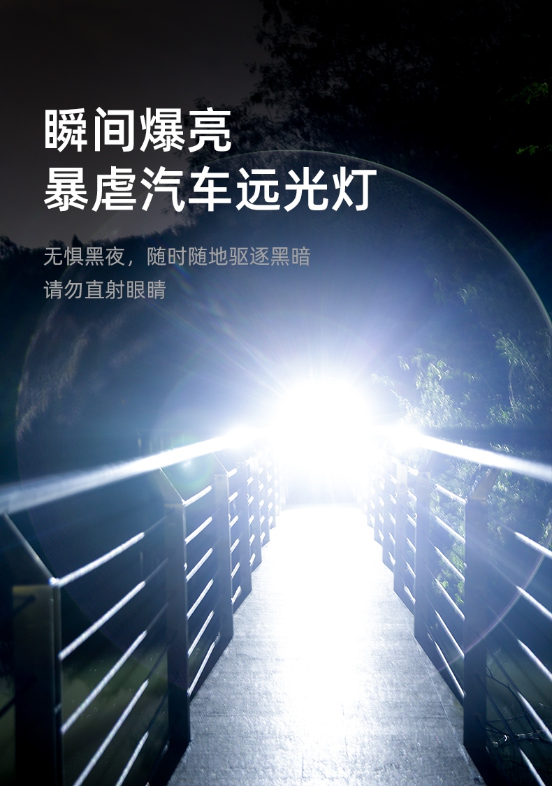 聚光主燈 亮度隨心 輕按后端開關按鈕,主燈強光點亮,續按依次切換主燈工作光-爆閃光。主燈開啟狀態下長按5秒,可實現光源色溫轉換。主燈關閉狀態下長按5秒,可開啟燈具最亮照明模式。 爆亮強光 亮如白晝 1500LM大功率高亮光源,點亮頃刻如白晝