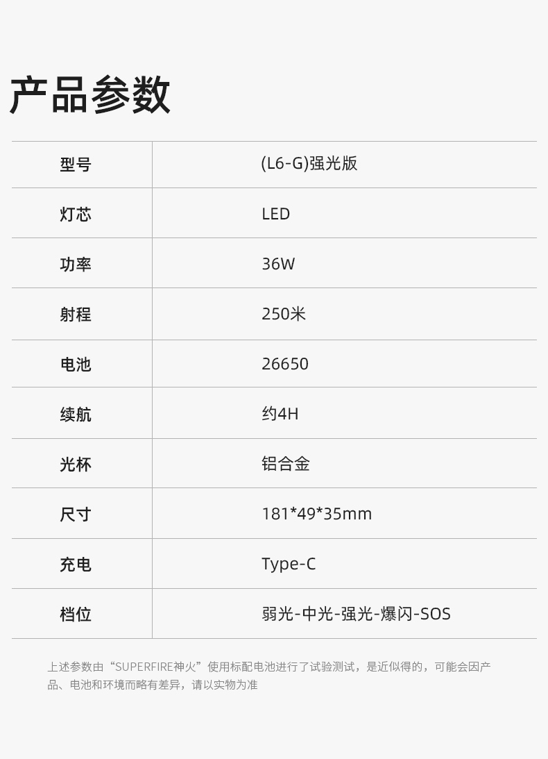 高亮燈珠 強勁輸出,照射范圍廣,250m強光遠射 尾部戰術開關,操作方便 多種光學檔位,滿足不同需求 持久續航,大容量電池 高等級防水,安全使用,不懼風雨 方形筒身,手感更舒適,舒適手感。