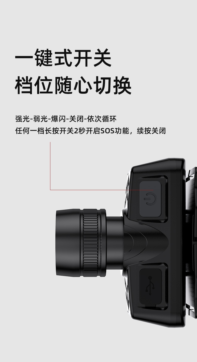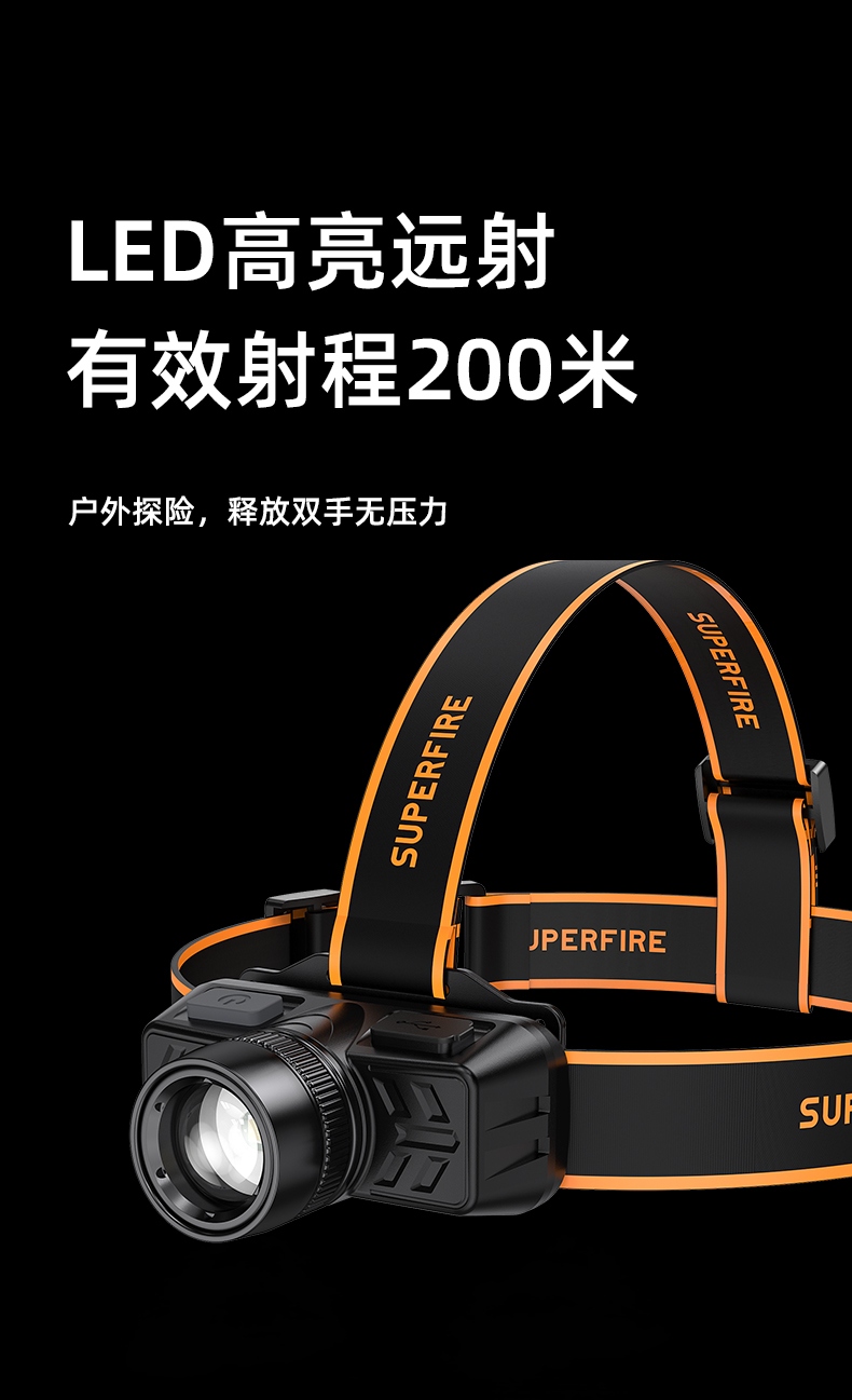 強光亮度,運動頭燈,前后均衡設(shè)計,輕便不壓頭,可調(diào)節(jié)式頭燈帶,佩戴方便舒適,伸縮調(diào)焦,光照范圍大,照射距離遠(yuǎn),頭燈角度調(diào)節(jié),超90度角度隨意調(diào)節(jié),適宜各種環(huán)境使用