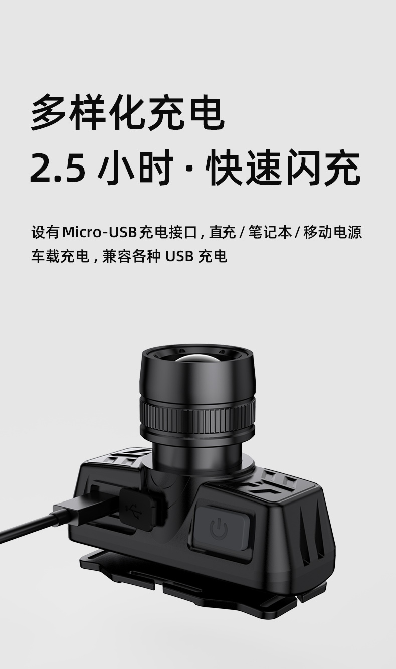 可調(diào)焦隨意調(diào)節(jié)光圈大小,小巧精致方便攜帶,USB充電使用方便,做釣魚燈、礦燈,頭燈使用