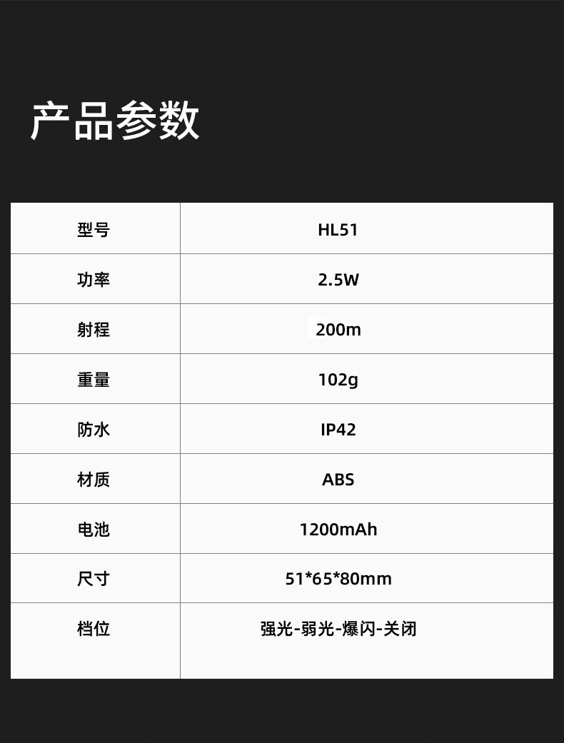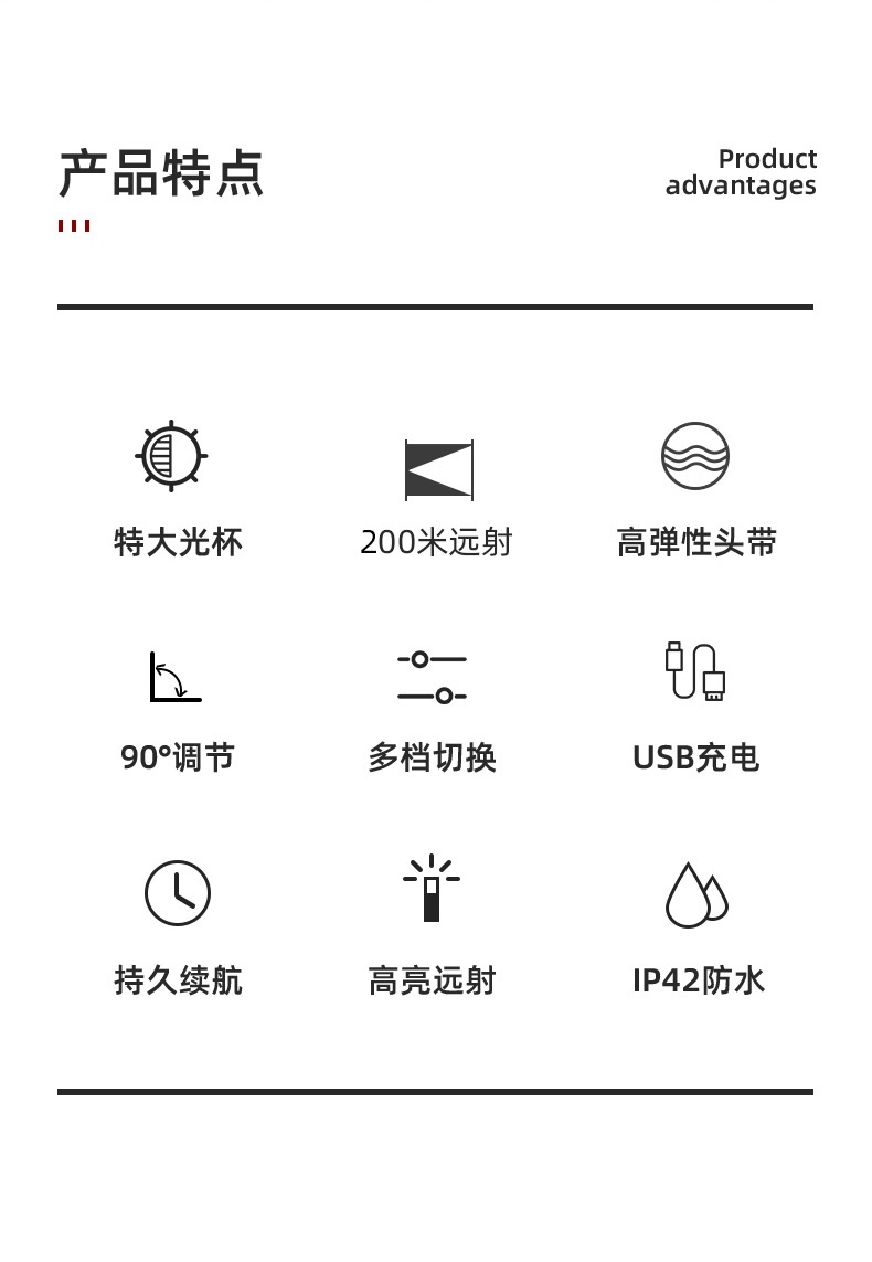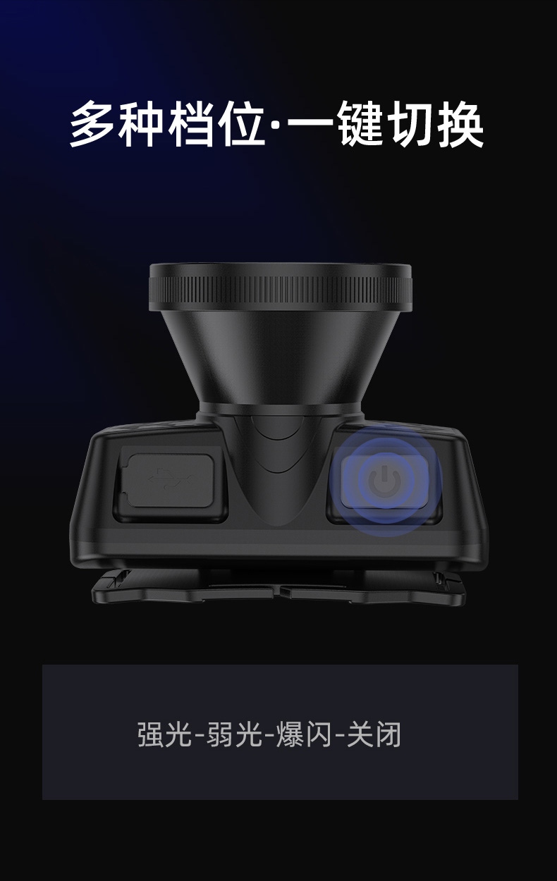 強光亮度,運動頭燈,前后均衡設計,輕便不壓頭,可調節式頭燈帶,佩戴方便舒適,伸縮調焦,光照范圍大,照射距離遠,頭燈角度調節,超90度角度隨意調節,適宜各種環境使用