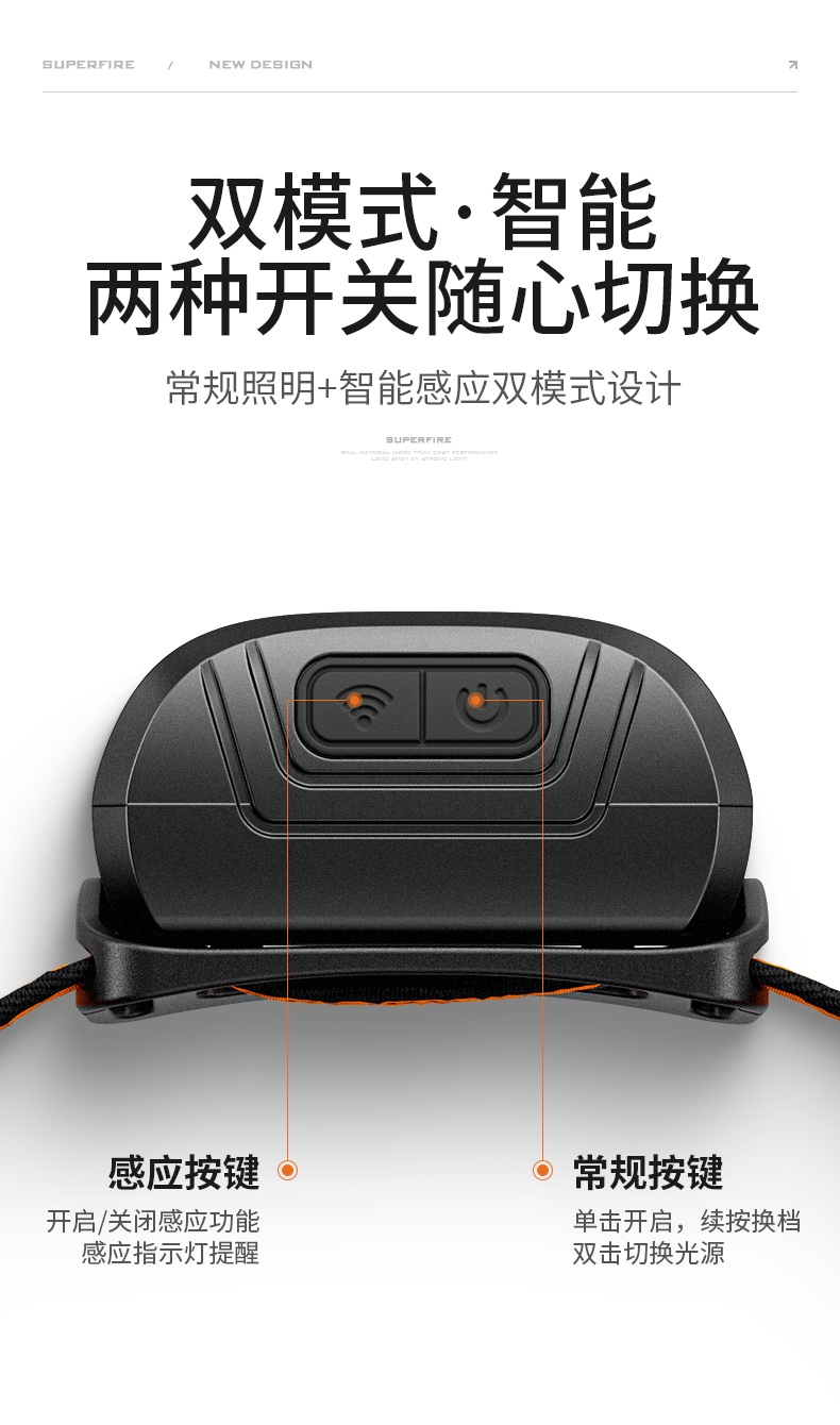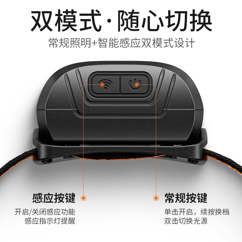 1.單擊頂部右側開關按鍵開啟光源,續按循環調檔(強光-中光-弱光-爆閃-SOS-關);任意檔位雙擊開啟暖光,單擊續按紅光-紅光爆閃-關,任意檔位長按2S關閉光源。 2.單擊頂部左側感應按鍵開啟/關閉感應功能,同步開啟感應指示燈提醒。