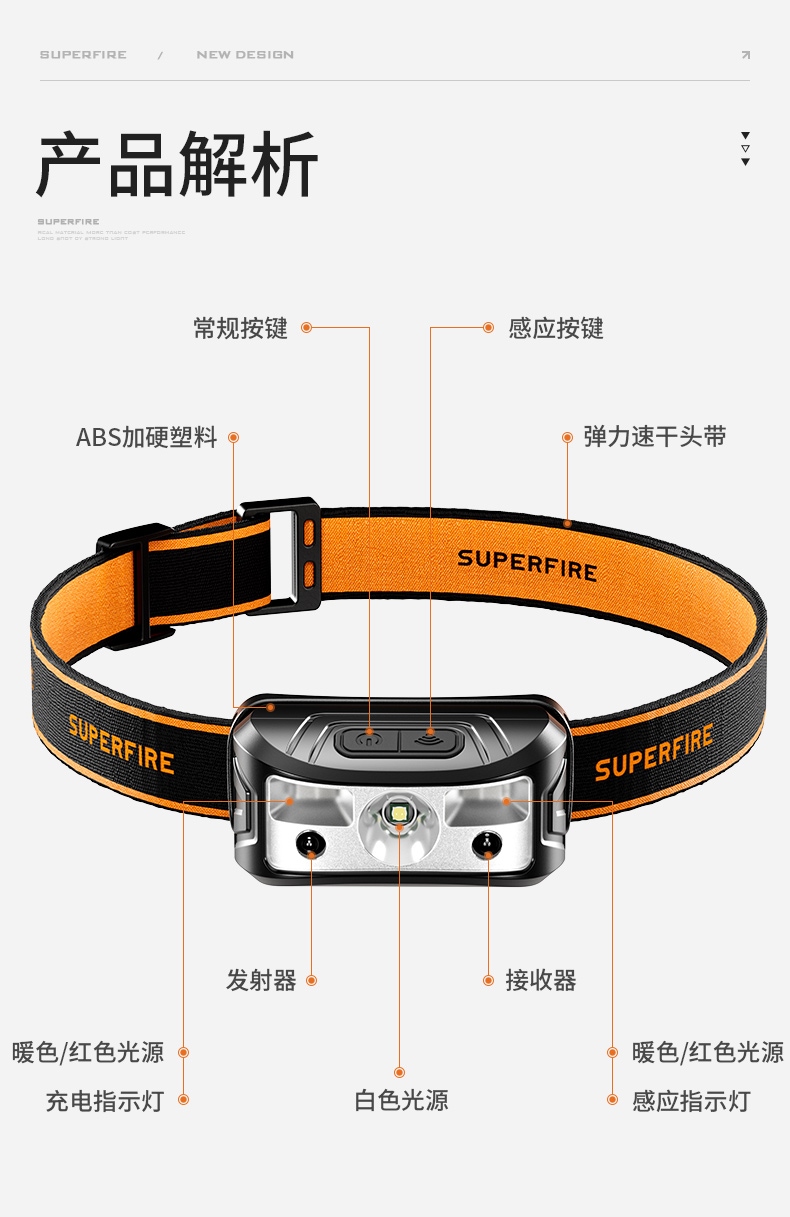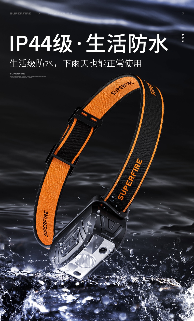 強光亮度,運動頭燈,前后均衡設計,輕便不壓頭,可調節式頭燈帶,佩戴方便舒適,伸縮調焦,光照范圍大,照射距離遠,頭燈角度調節,超90度角度隨意調節,適宜各種環境使用