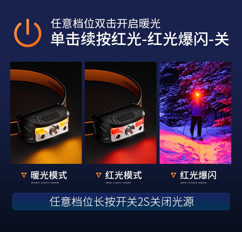 1.單擊頂部右側開關按鍵開啟光源,續按循環調檔(強光-中光-弱光-爆閃-SOS-關);任意檔位雙擊開啟暖光,單擊續按紅光-紅光爆閃-關,任意檔位長按2S關閉光源。