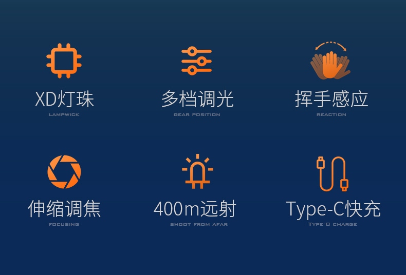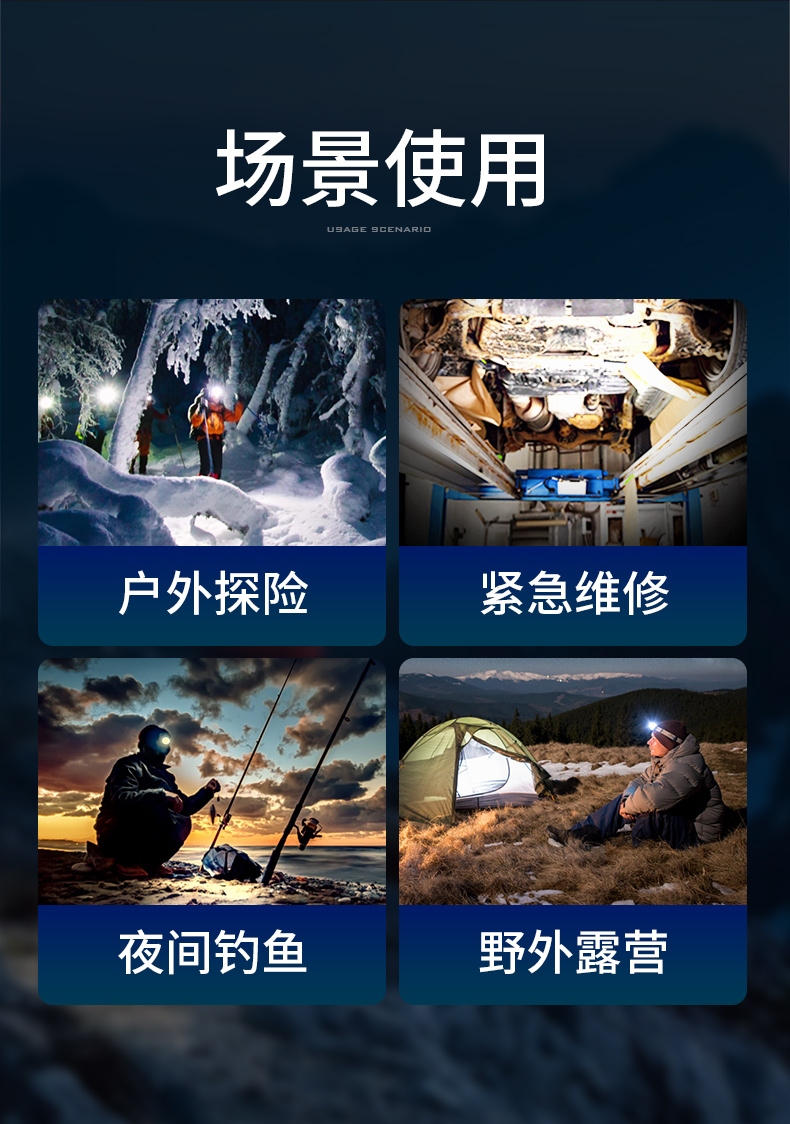 1.開啟光源:按壓燈頭開關按鍵開啟即強光檔 ,續按調檔(強光-中光-弱光-爆閃-SOS-關)可順序調檔;任意長按2秒左右開啟感應模式(手掃可開關光源)同時感應指示燈亮。 2.可調節式松緊帶:佩戴方便舒適。 3.頭燈角度調節:超90°角度隨意調節,適宜各環境使用
