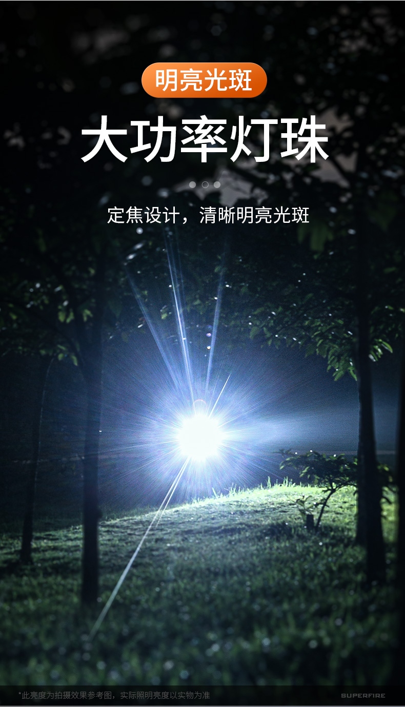 1、千米遠(yuǎn)射,射程更遠(yuǎn),光斑更聚焦。 2、進(jìn)口燈珠,亮度高,照明效果更好。 3、前后雙按鍵,光源一鍵點(diǎn)亮,高亮瞬間開啟。