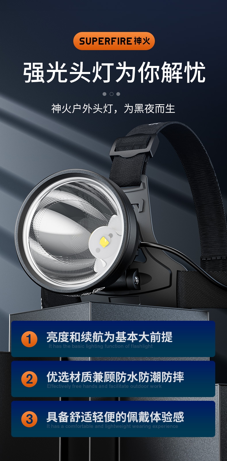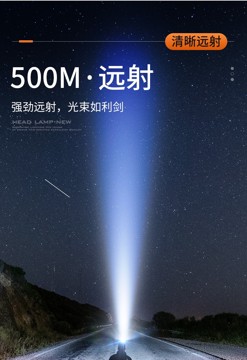 1、20W大功率,亮度高,照面效果好。 2、鋁合金頭部,防水耐摔。 3、頭燈角度調節:超90°角度隨意調節,適宜各環境使用。