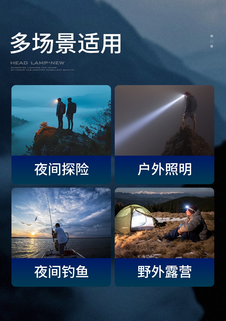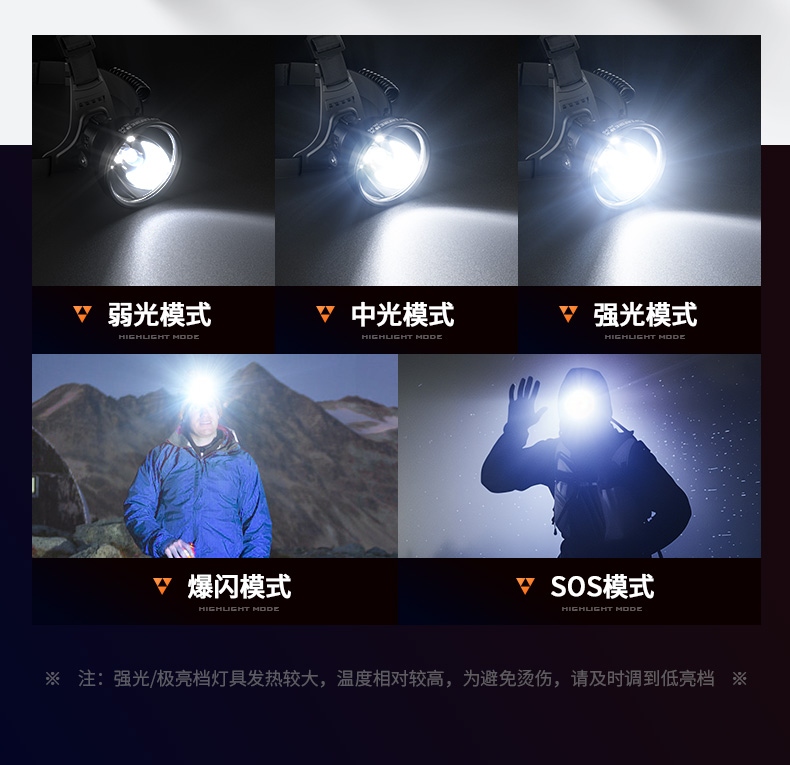 1、五檔一體:弱中強、爆閃、SOS自由切換,可滿足不同場景下的使用需求 。