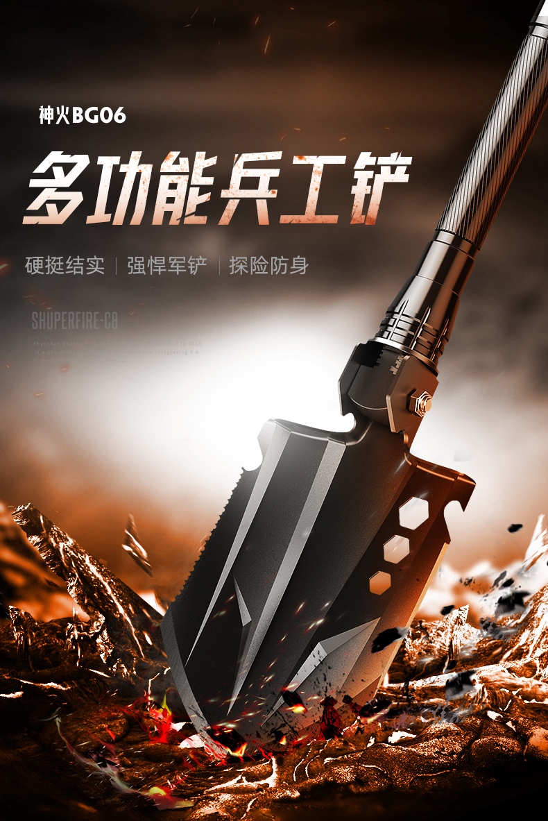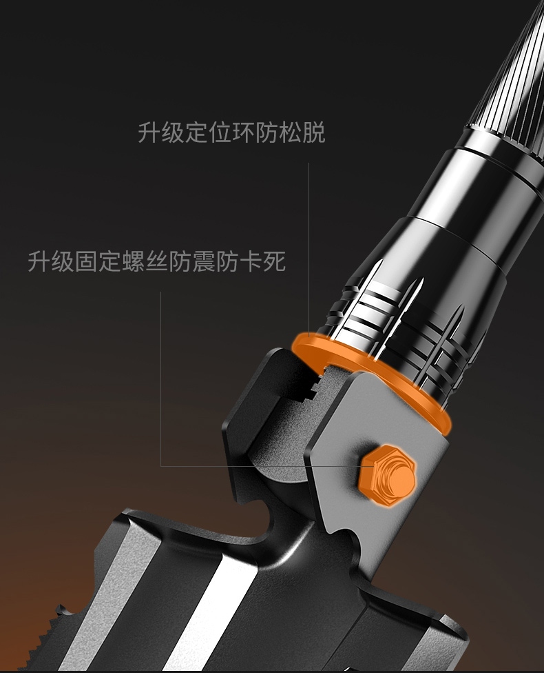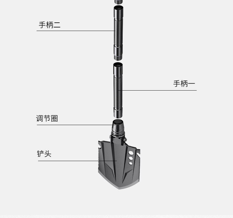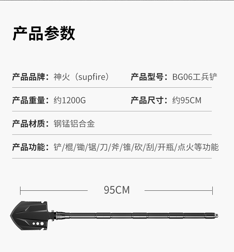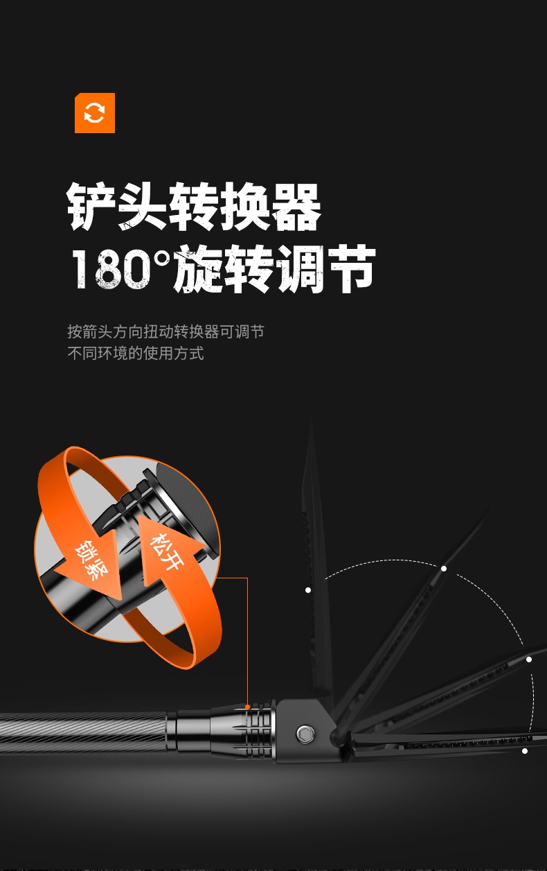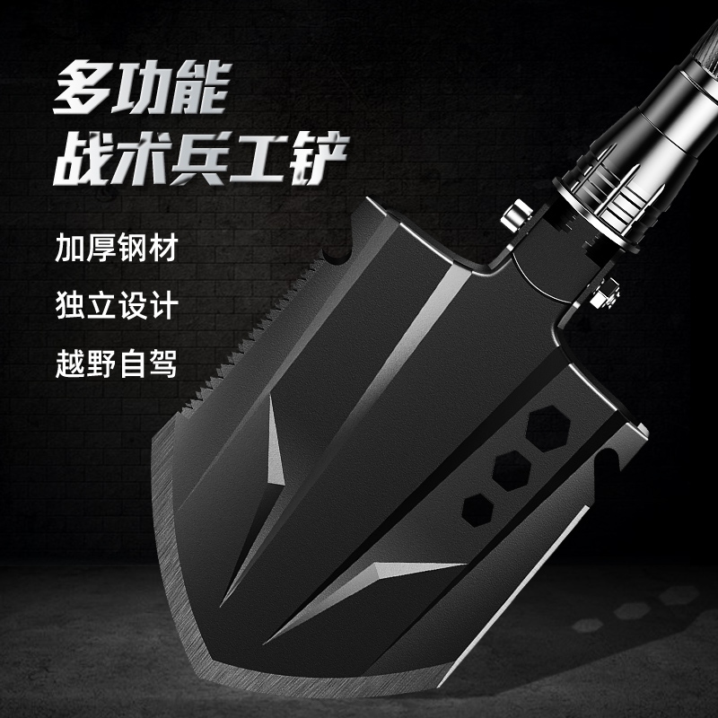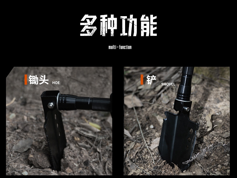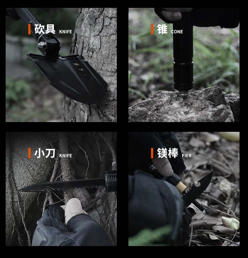 多功能,戰(zhàn)術(shù)兵工鏟,堅挺結(jié)實,強悍軍產(chǎn),探險防身,四節(jié)鋁合金手柄,鏟頭可180° 旋轉(zhuǎn)調(diào)節(jié)尾部帶攻擊錘 。 可鏟、棍、鋤 、鋸 、刀 、斧 、錐、砍 、刮 、開瓶 、點火等功能 。