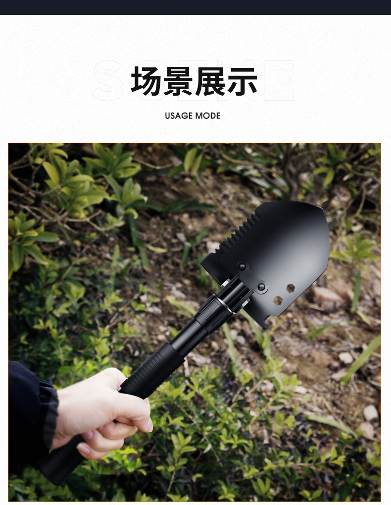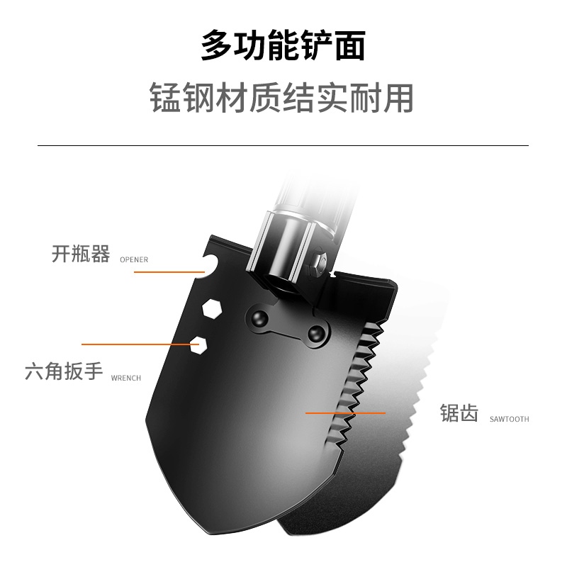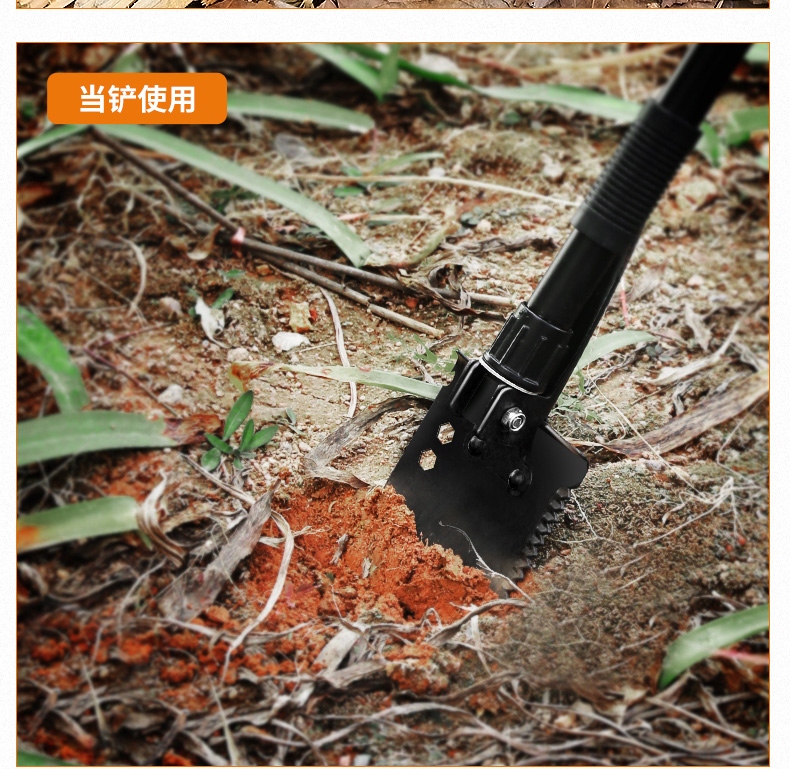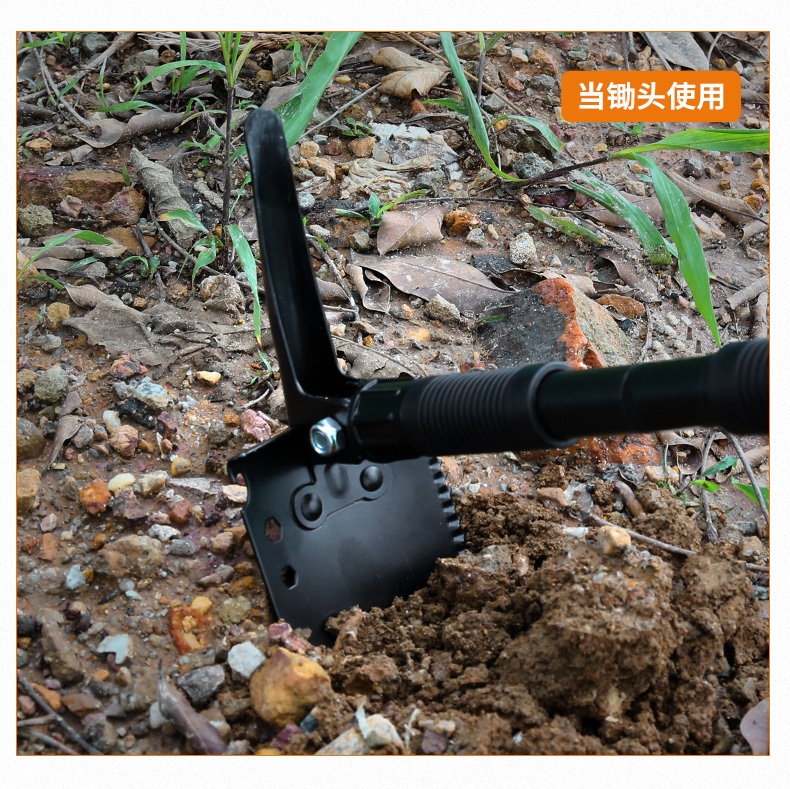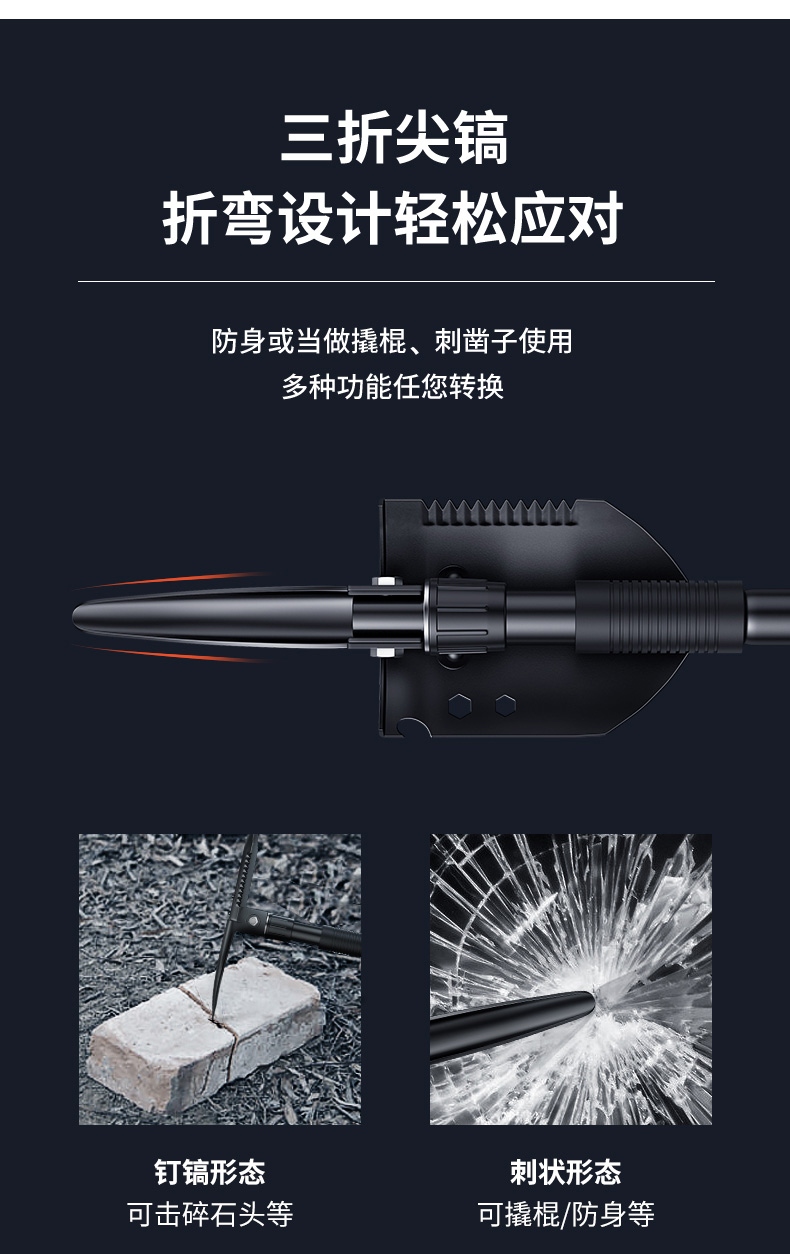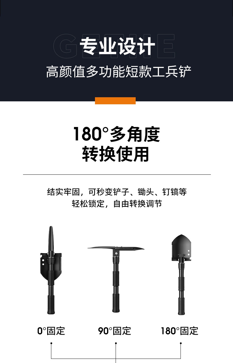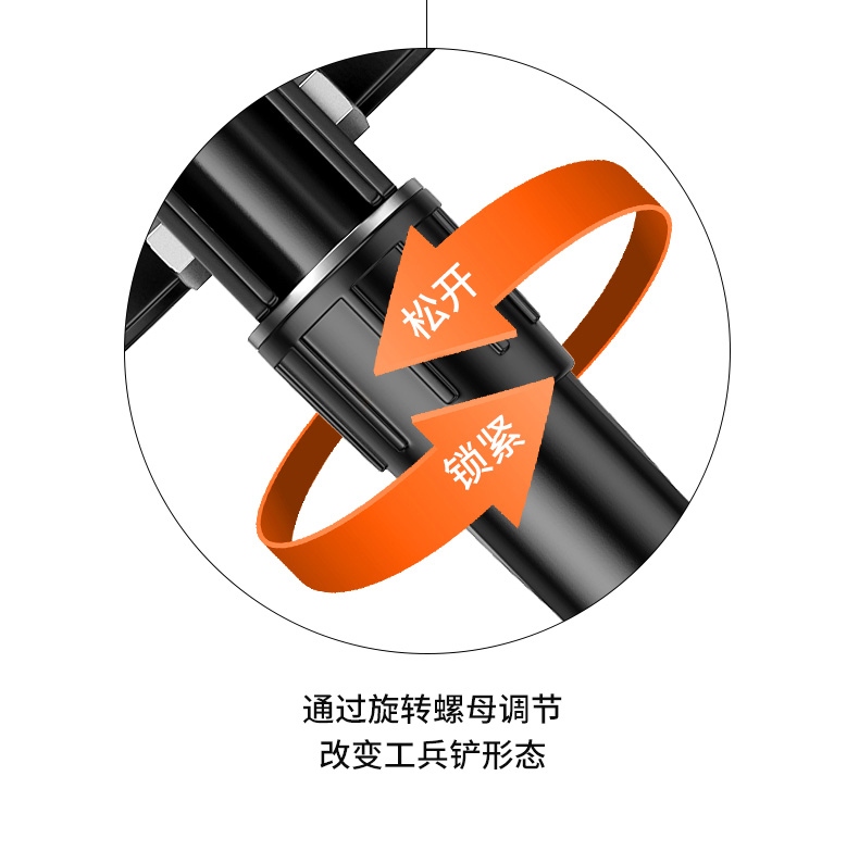 可變鏟子、鋤頭、釘鎬等,鏟頭自由轉(zhuǎn)換調(diào)節(jié)(可0°、90°、180°固定),通過(guò)旋轉(zhuǎn)螺母調(diào)節(jié)改變工兵鏟形態(tài)。