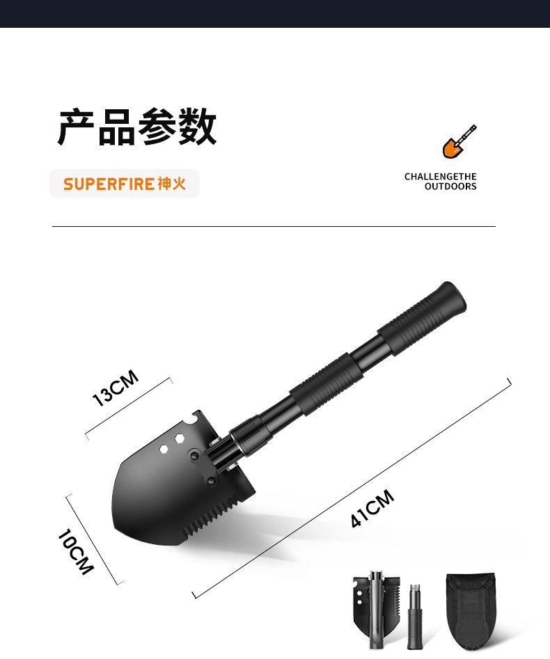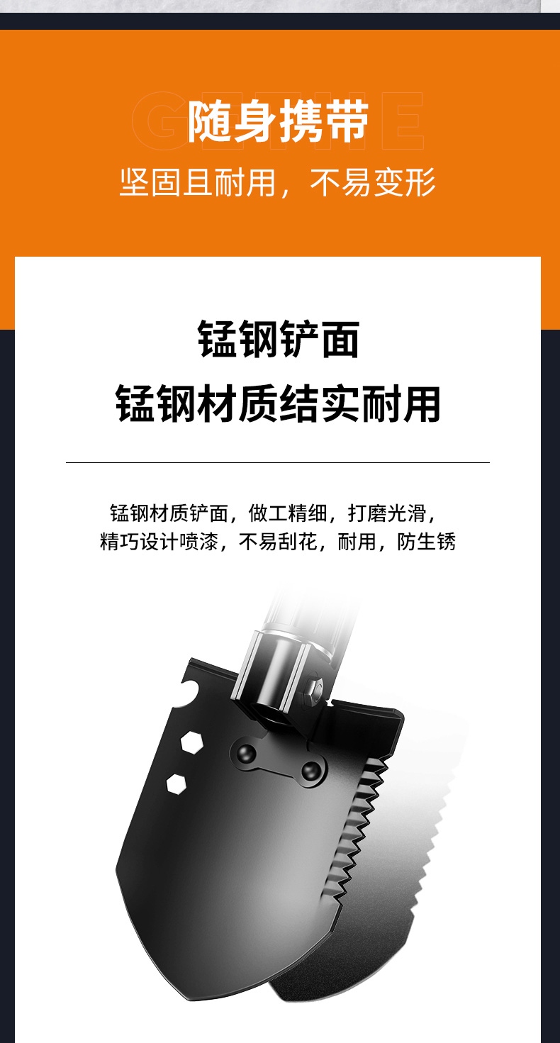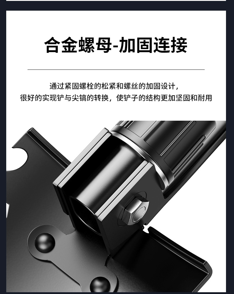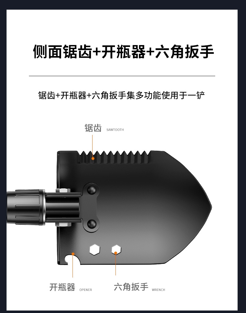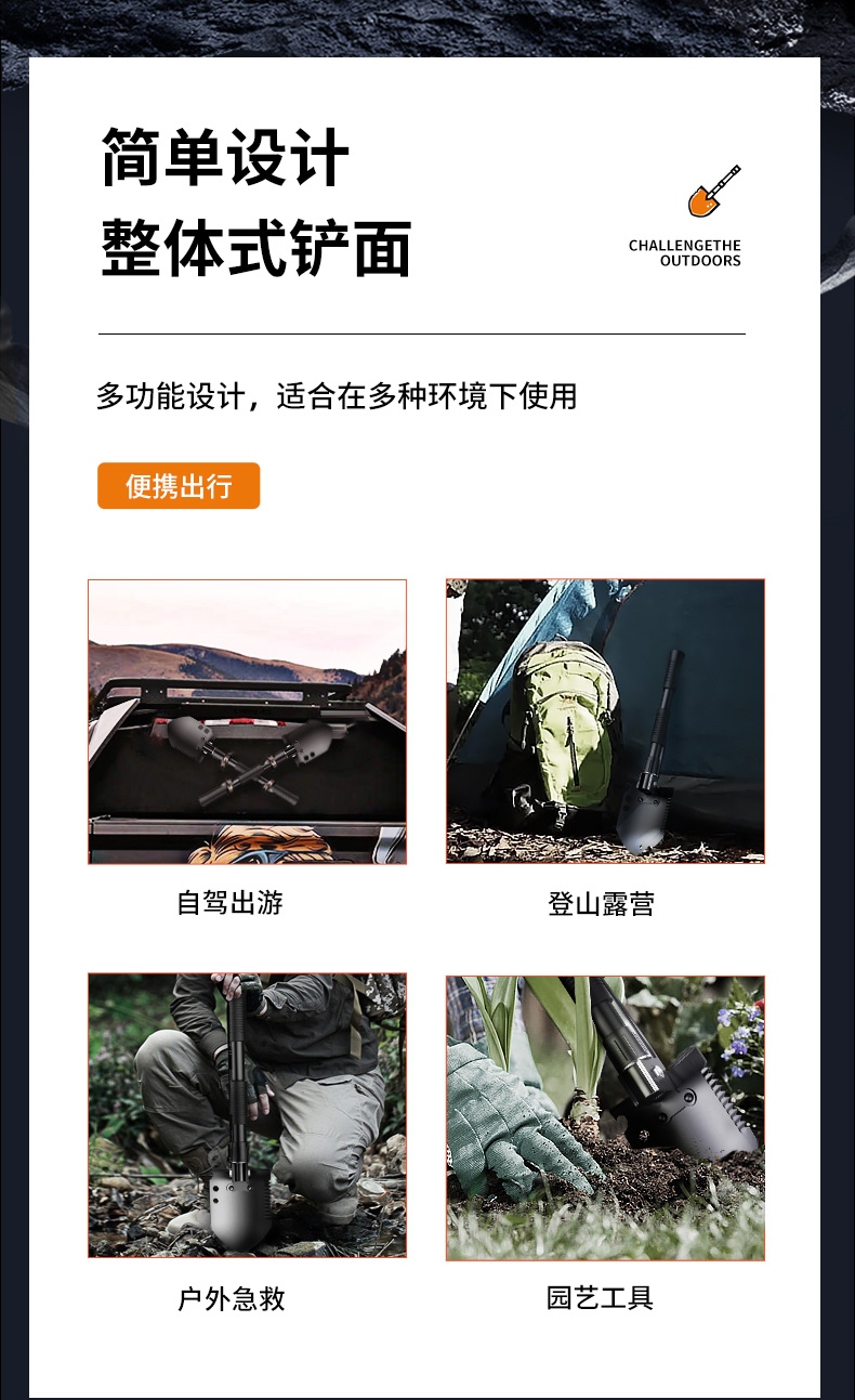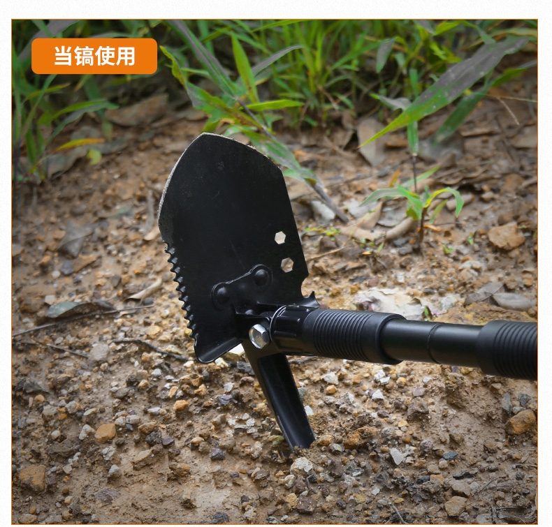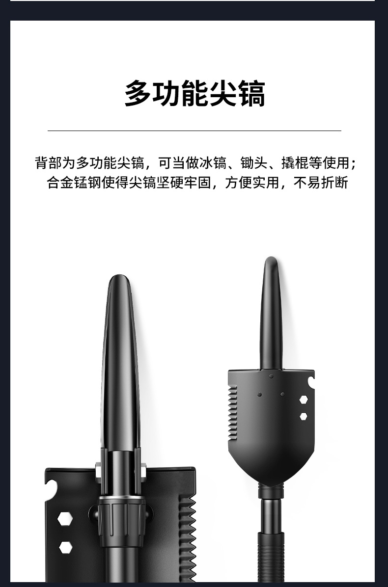 可變鏟子、鋤頭、釘鎬等,鏟頭自由轉(zhuǎn)換調(diào)節(jié)(可0°、90°、180°固定),通過(guò)旋轉(zhuǎn)螺母調(diào)節(jié)改變工兵鏟形態(tài)。