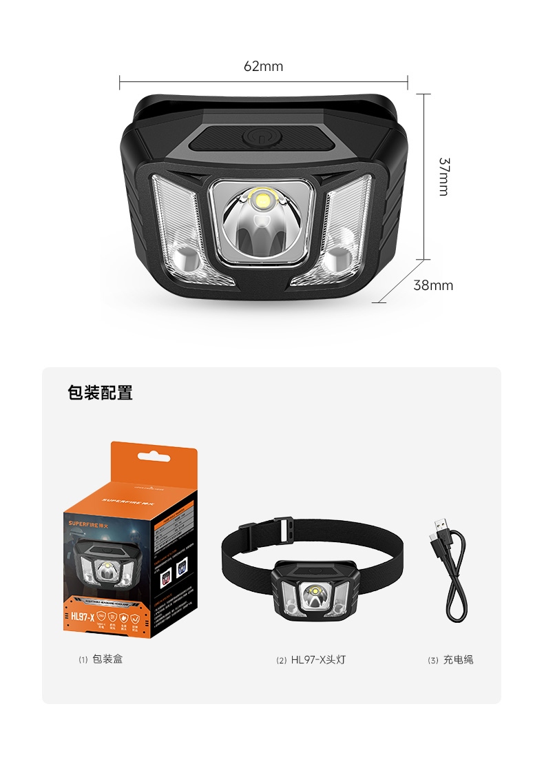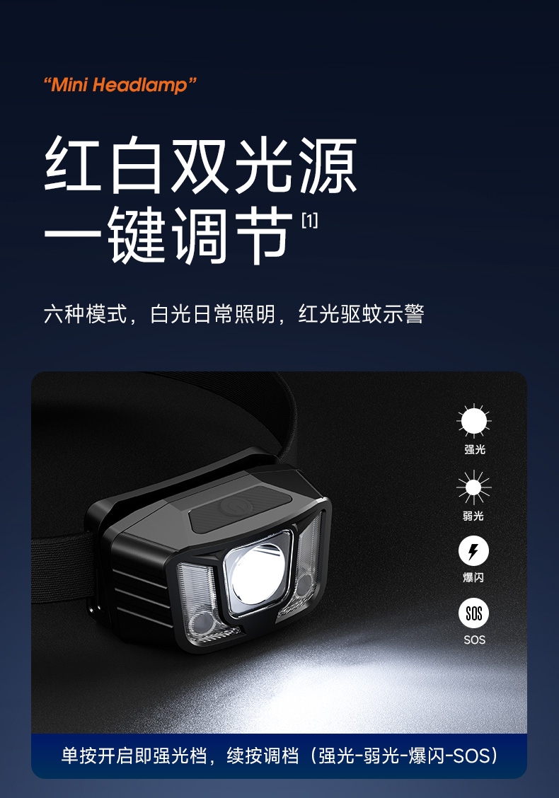 2.此款頭燈帶有紅常亮-紅光爆閃,可作警示作用。