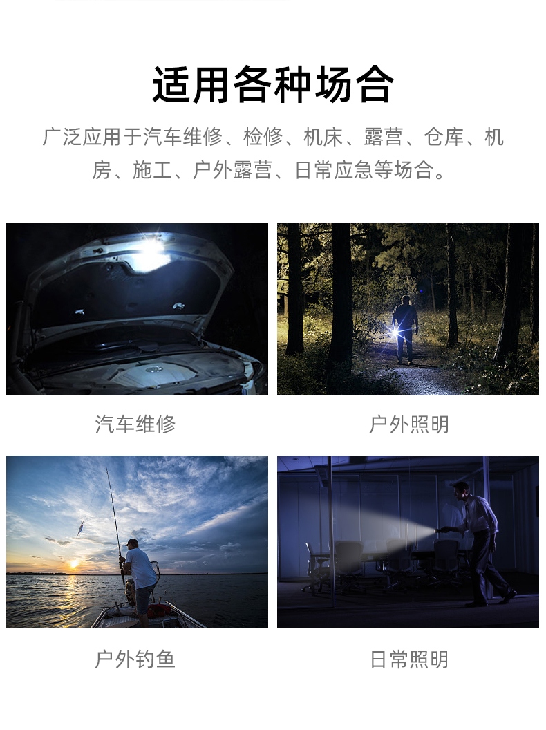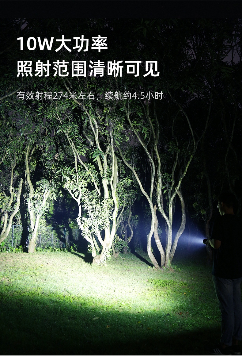 聚光主燈 亮度隨心 輕按后端開關按鈕,主燈強光點亮,續按依次切換主燈工作光-爆閃光。主燈開啟狀態下長按5秒,可實現光源色溫轉換。主燈關閉狀態下長按5秒,可開啟燈具最亮照明模式。 爆亮強光 亮如白晝 1500LM大功率高亮光源,點亮頃刻如白晝