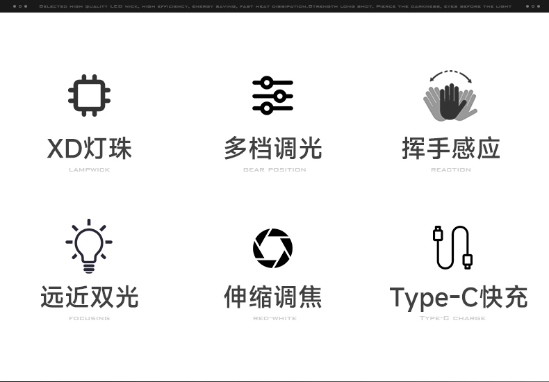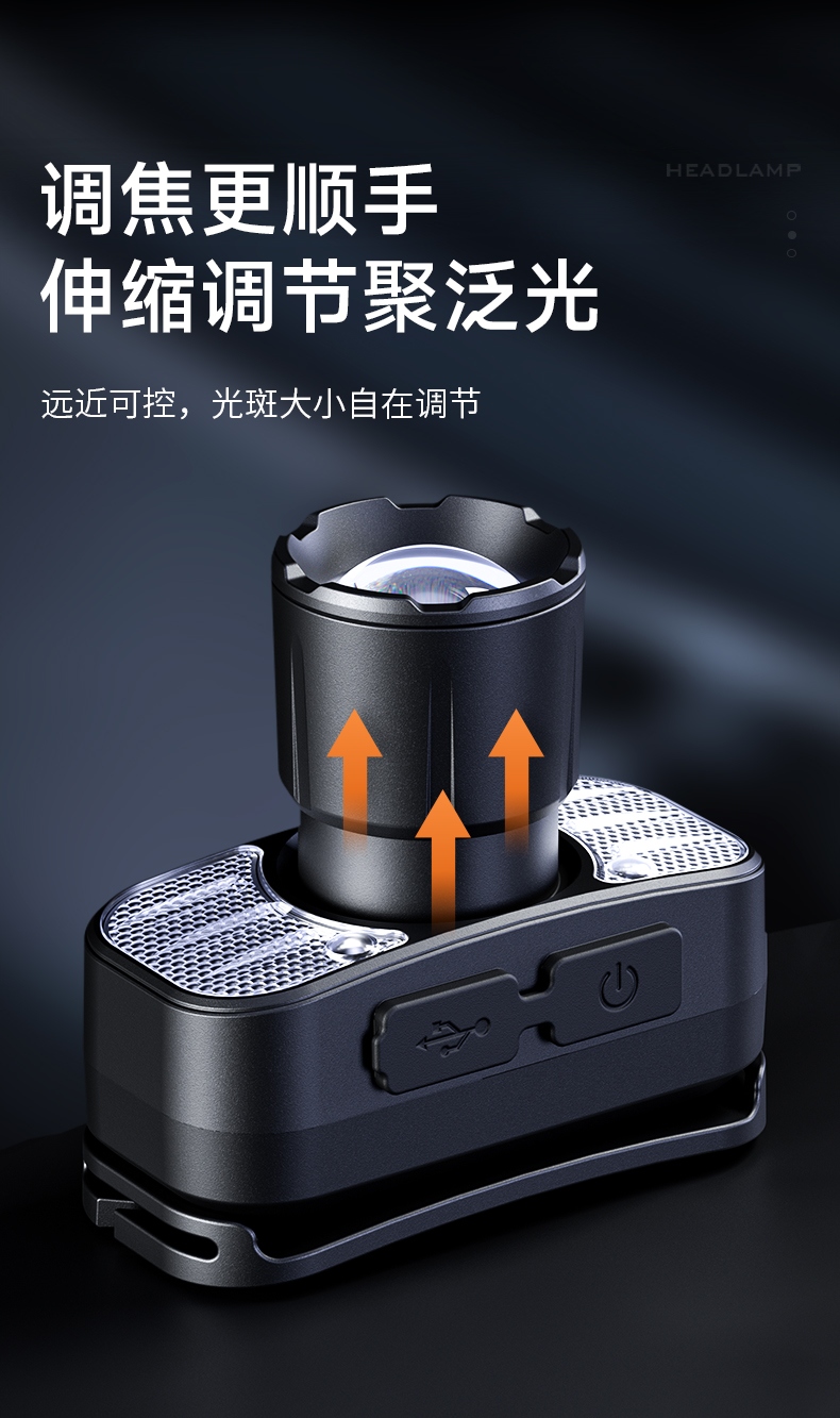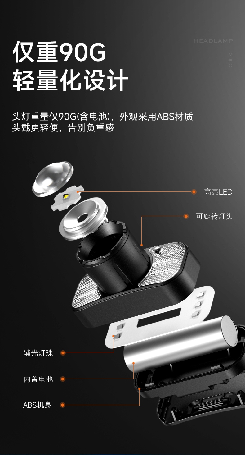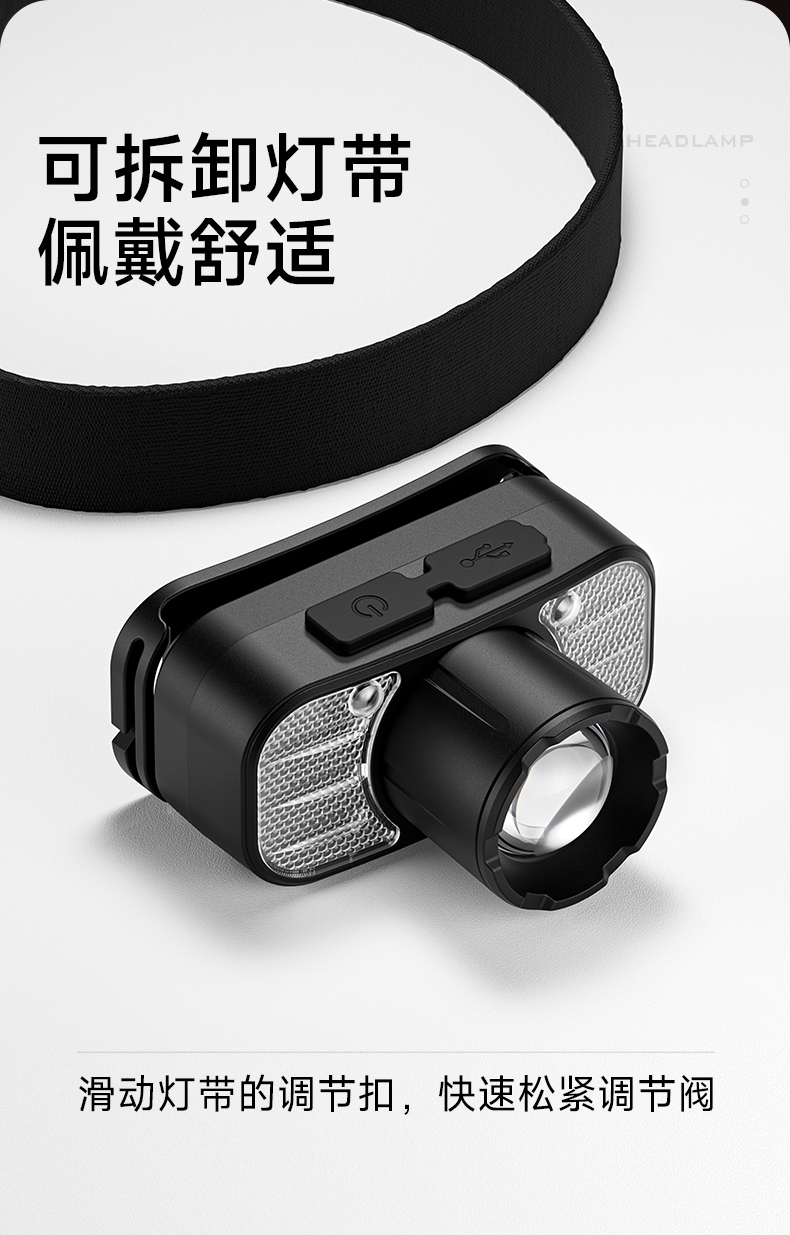 6.此款頭燈款式潮流、設(shè)計(jì)小巧、攜帶方便、頭帶材質(zhì)柔軟、可自由拆卸、便于清洗。