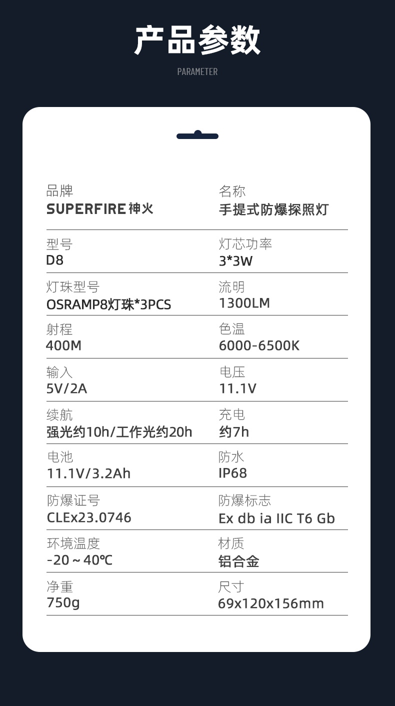 1、多檔調(diào)光,可滿足不同使用場景下的照明需求; 2、含提手,握感更舒適。攜帶更簡單; 3、新型高亮遠射燈珠,60W大功率,亮度高,照明效果好。
