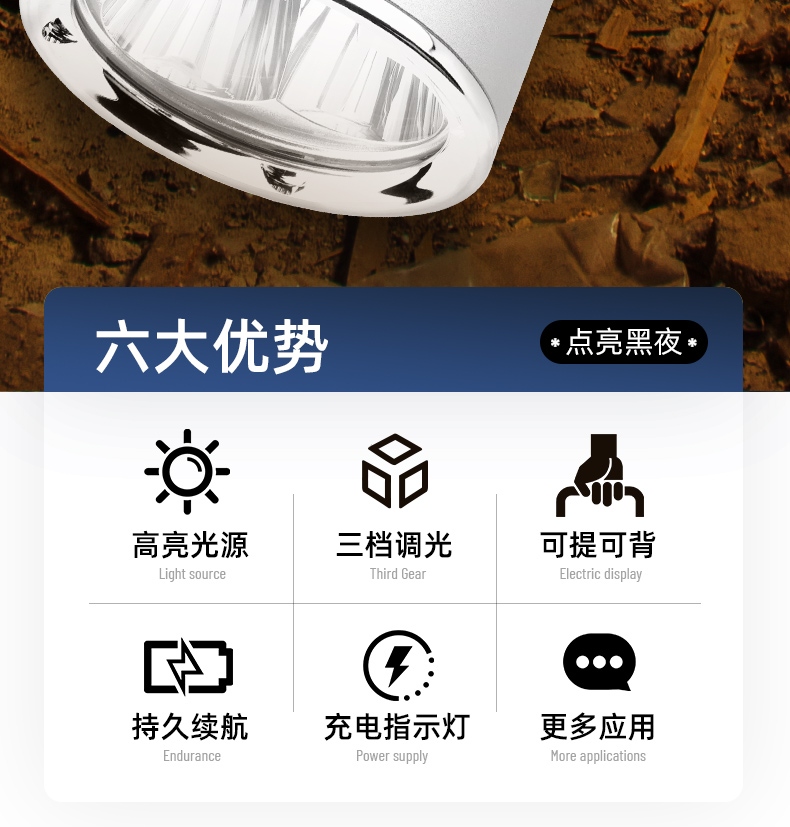 1、六檔調(diào)光,可滿足不同使用場景下的照明需求。 2、進口高亮朗明納斯燈珠,照明效果更好。 3、含檔位記憶,任意檔位快捷關(guān)機 ,開機恢復(fù)關(guān)機前檔位。