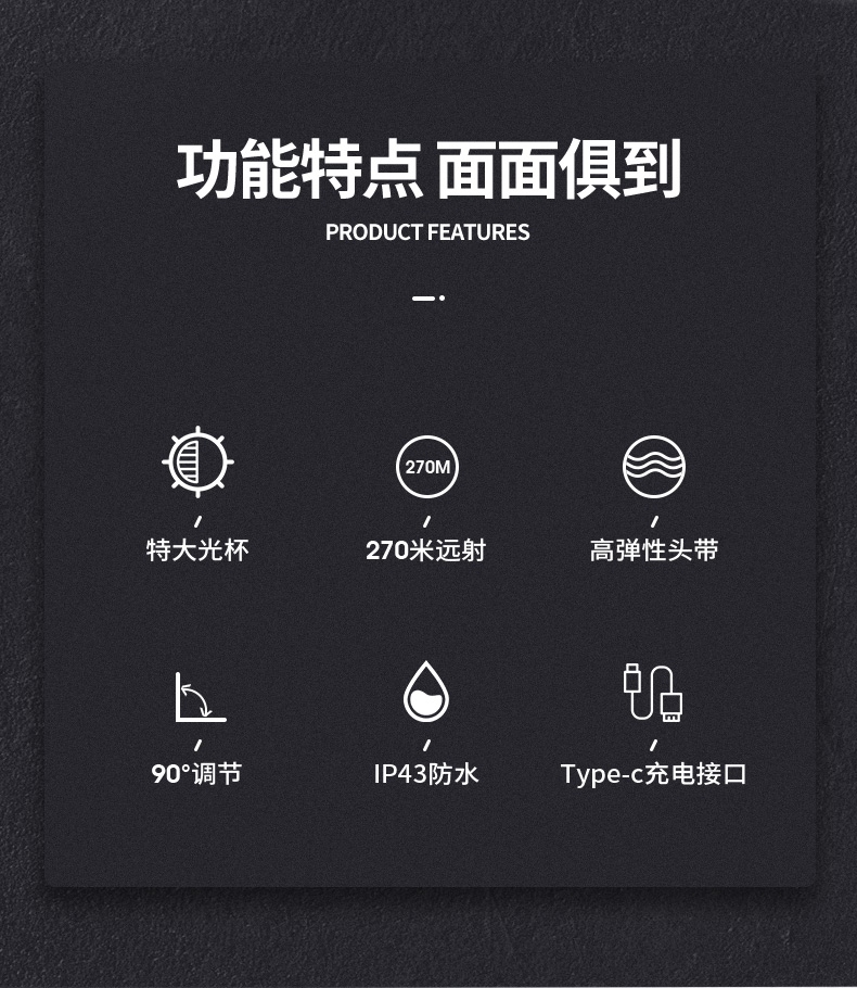 強(qiáng)光亮度,運動頭燈,前后均衡設(shè)計,輕便不壓頭,可調(diào)節(jié)式頭燈帶,佩戴方便舒適,伸縮調(diào)焦,光照范圍大,照射距離遠(yuǎn),頭燈角度調(diào)節(jié),超90度角度隨意調(diào)節(jié),適宜各種環(huán)境使用