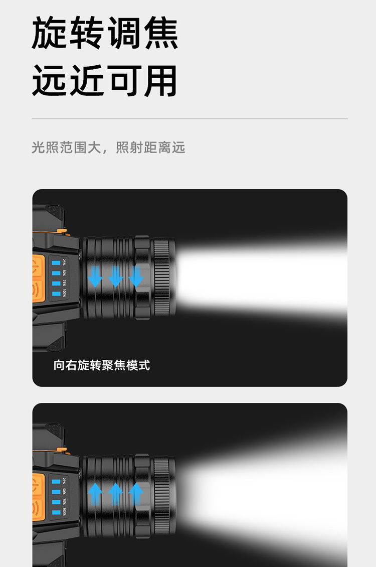 1、多檔調光,可滿足不同使用場景下的照明需求; 2、含提手,握感更舒適。攜帶更簡單; 3、新型高亮遠射燈珠,60W大功率,亮度高,照明效果好。