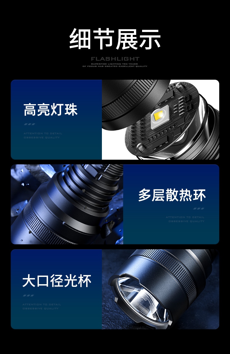 1、大尺寸鋁合金光杯,光斑更圓潤。 2、新型高亮遠(yuǎn)射燈珠,40W大功率,亮度高,照明效果好。
