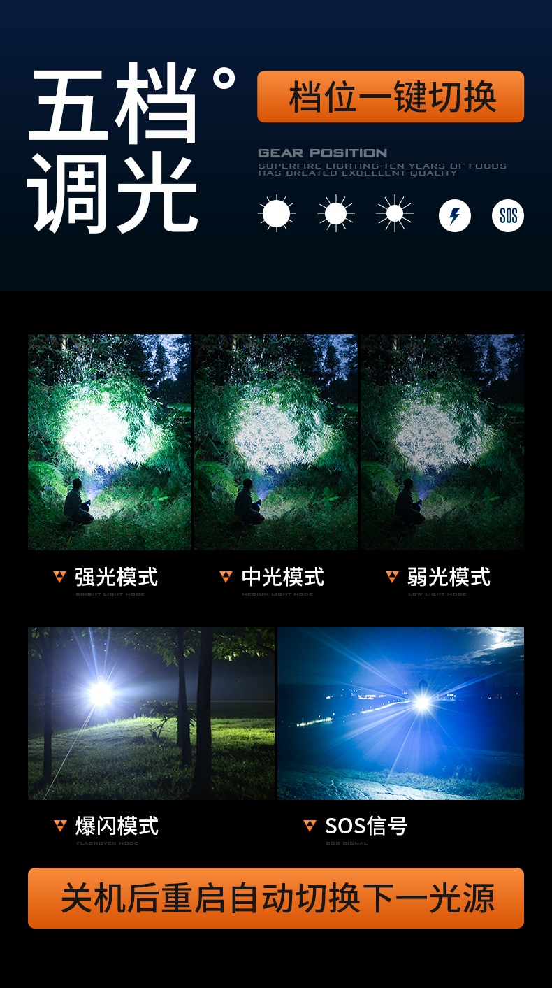 1、六檔調(diào)光,可滿足不同使用場景下的照明需求。 2、進(jìn)口高亮朗明納斯燈珠,照明效果更好。 3、含檔位記憶,任意檔位快捷關(guān)機(jī) ,開機(jī)恢復(fù)關(guān)機(jī)前檔位。