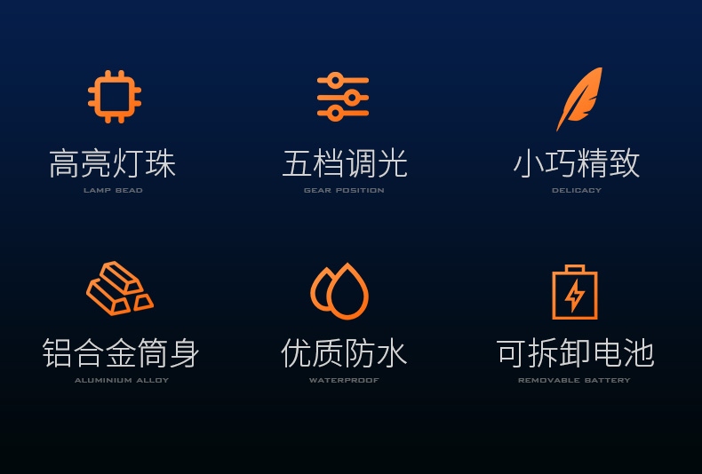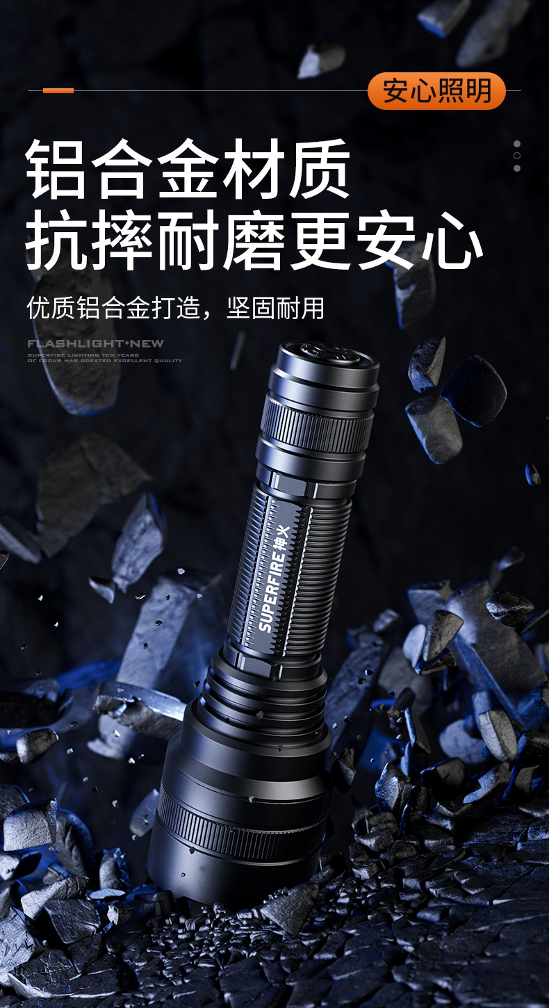 1、多檔調(diào)光,可滿足不同環(huán)境下的照明需求。 2、鋁合金筒身,防水耐摔。 3、外置電池,可隨時(shí)更換電池,滿足長時(shí)間續(xù)航。