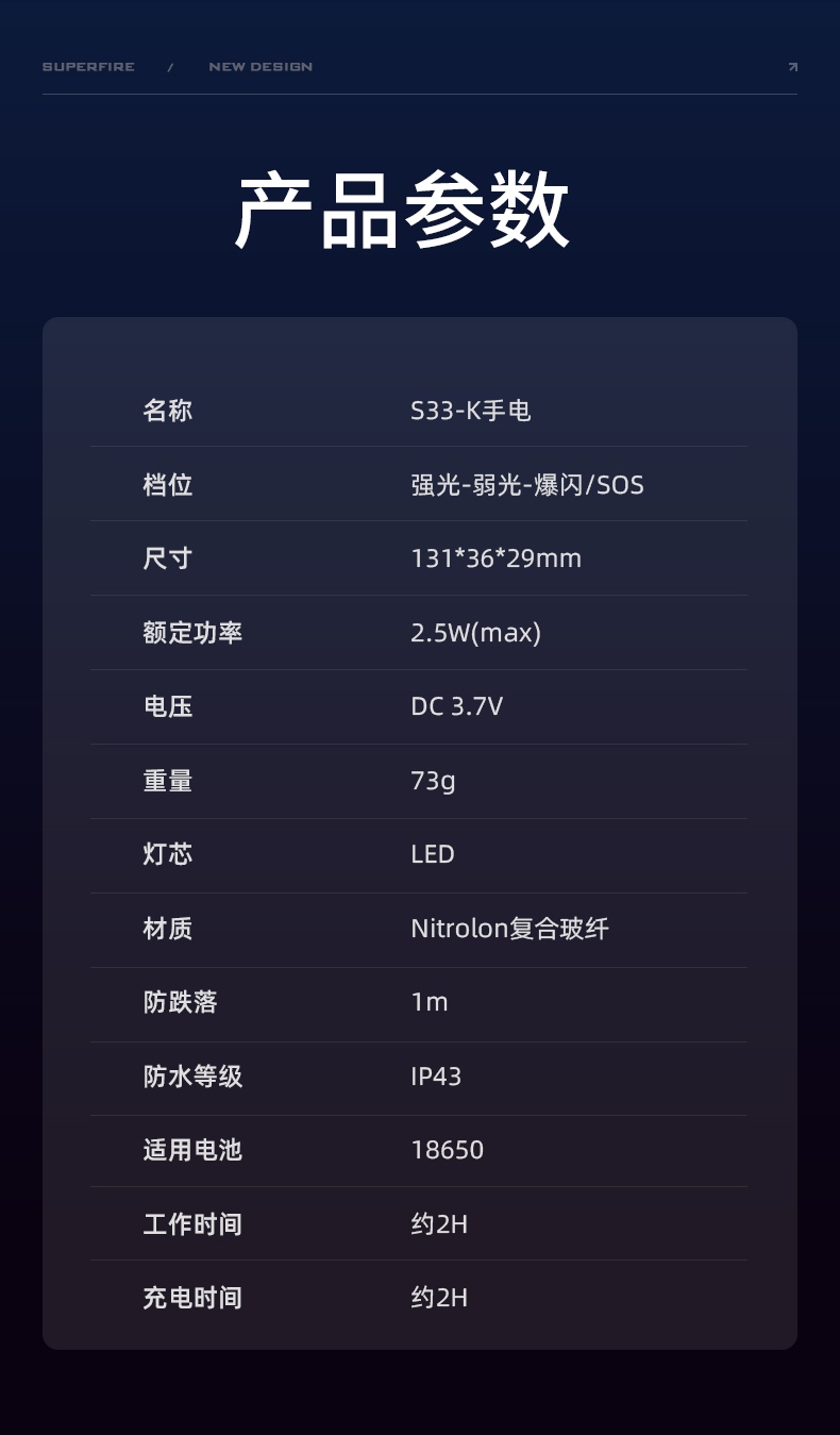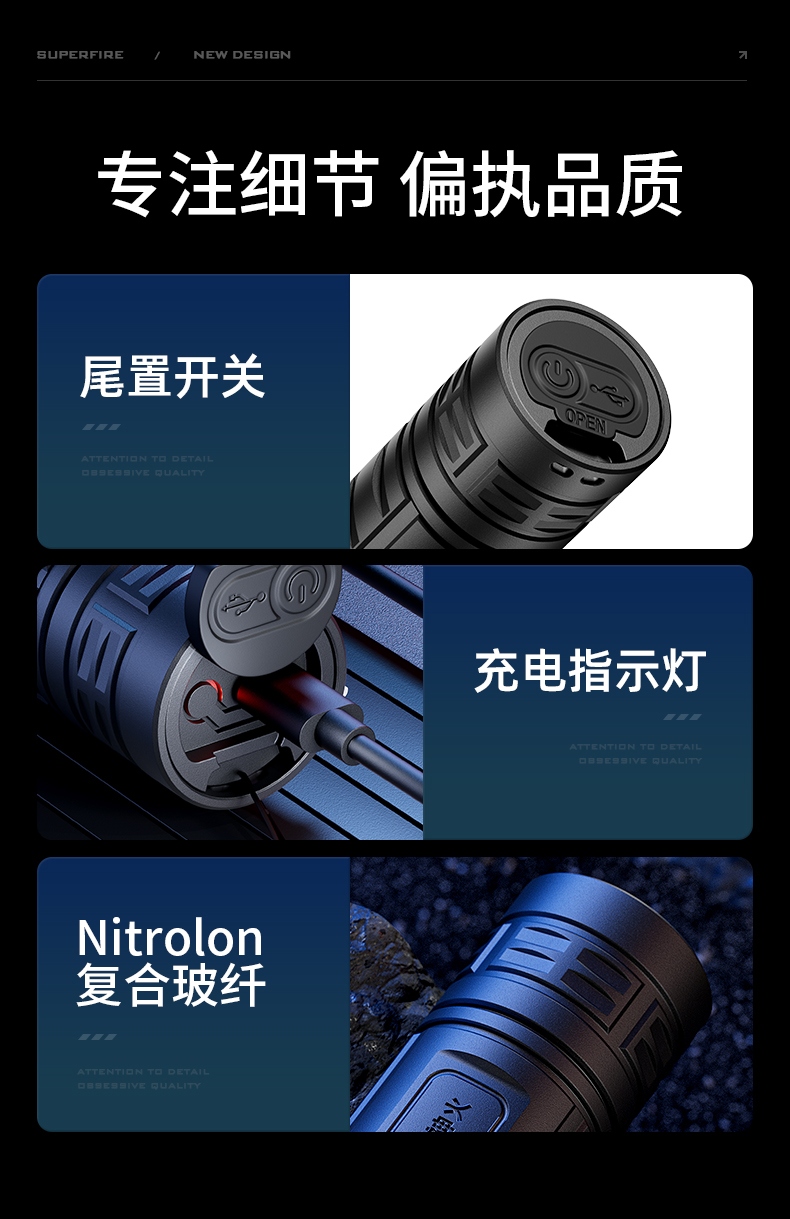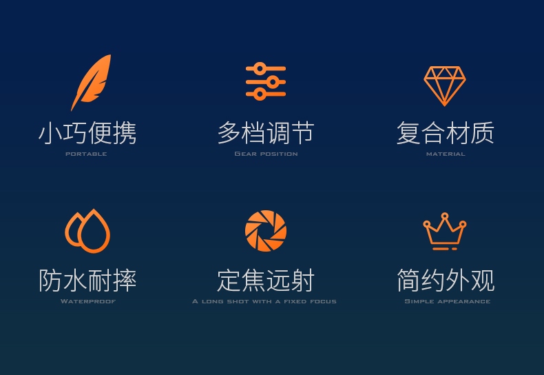 1、四檔調光,滿足不同場景下的使用需求 。 2、小巧便攜,重量輕,攜帶更方便。 3、采用Nitrolon玻纖復合材質,增強產品剛性和高溫穩定性 ,耐沖擊,耐腐蝕。
